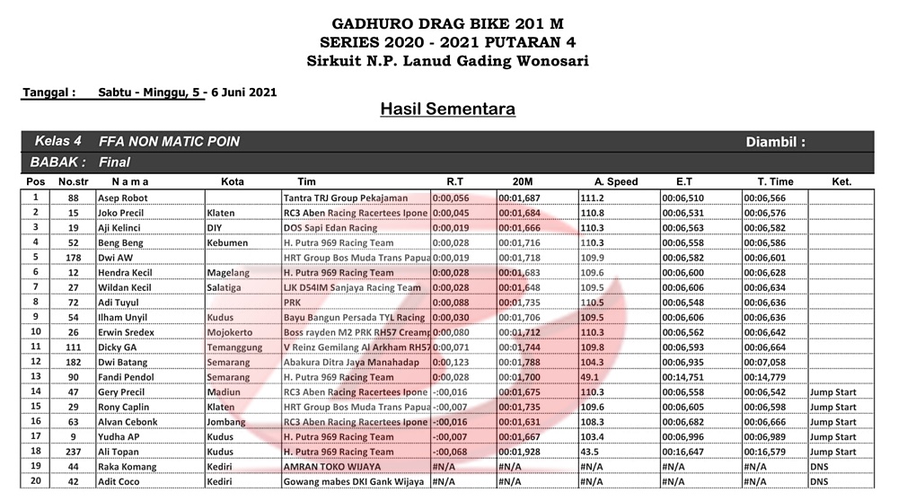 BalapMotor.Net – Pertarungan di kelas Free For All (FFA) dalam kejuaraan Gadhuro Drag Bike Series putaran 4 yang berlangsung di sirkuit Lanud Gading, Wonosari, Yogyakarta (6 Juni) sulit diprediksi.