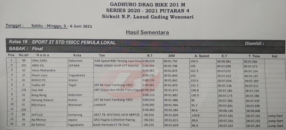 Okto Zalfa catatkan waktu yang bagus di sirkuit yang Lanud Gading, Wonosari, Yogyakarta dengan time 7,065 detik. Menariknya, motor tersebut baru jadi hari sabtu dan minggu langsung dipakai main.