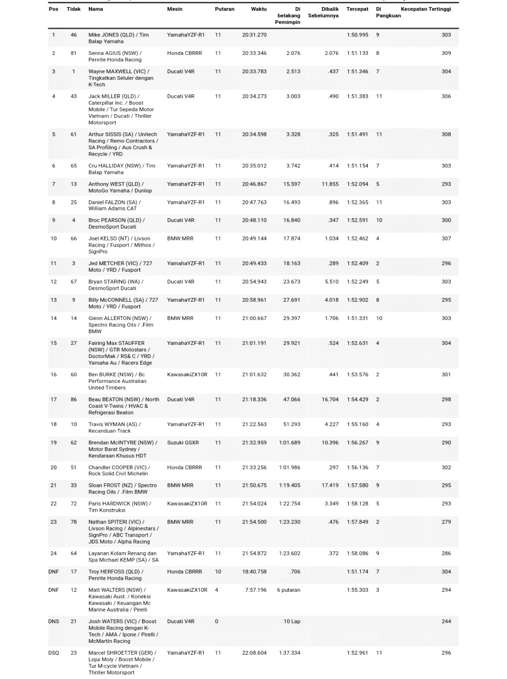 Namun, Miller yang memacu Ducati Panigale V4R itu gagal mempertahankan posisi terdepan dan akhirnya terlempar di urutan keempat. Meskipun gagal meraih tujuannya untuk kembali podium di ASBK, Miller mengaku tetap senang.