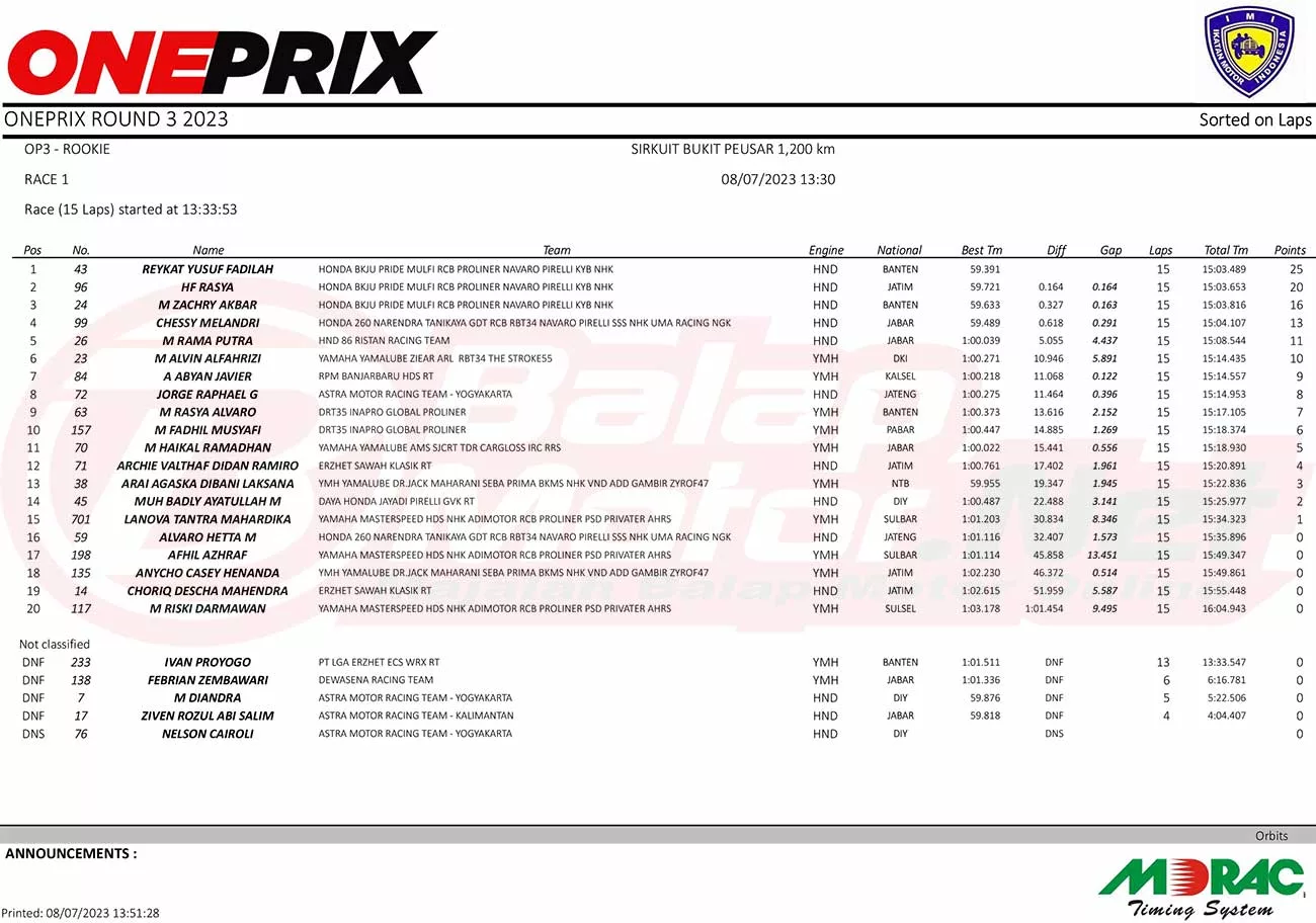 Pada gelaran ronde ketiga Oneprix tersebut, trio Rookie Honda BKJU ini berhasil menguasai podium race 1. Jadi Reykat, HF Rasya dan Zachry mengisi posisi 1,2 dan 3 di podium juara.
