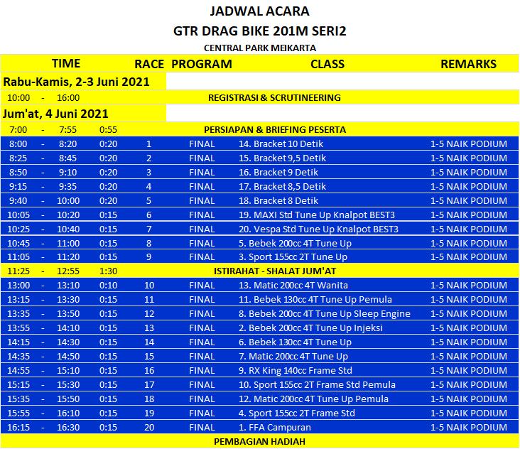 Event GTR Drag Bike dan Drag Race ini sendiri bakal digelar di trek kawasan Central Park, Meikarta Kabupaten Bekasi, Jawa Barat. Promotornya tentunya adalah Gass Tipis Racing yang dikomandoi oleh Eby.