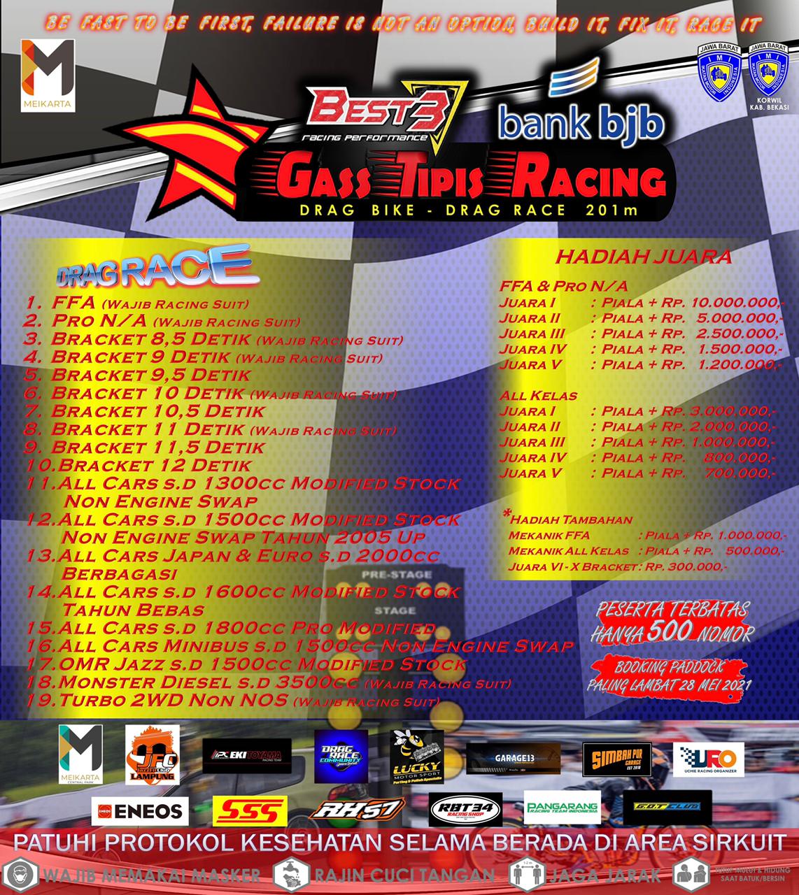 Selain adanya dua event Kejurnas Motoprix yaitu di Semarang (Jateng) dan di Sawahlunto (Sumbar), gelaran Gass Tipis Racing (GTR) Drag Bike dan Drag Race juga bakalan digelar pada 4-6 Juni 2021 nanti.