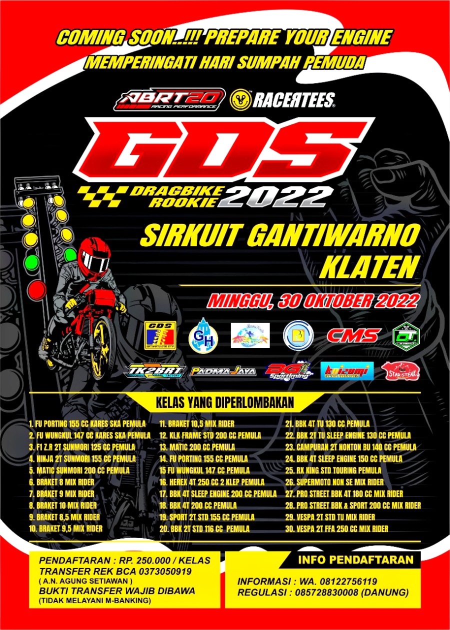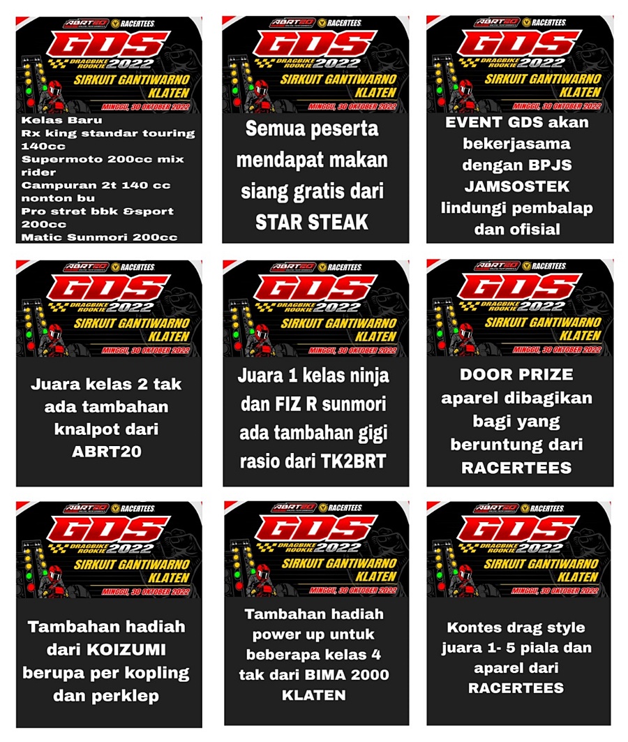 “Untuk event besok ada tambahan hadiah knalpot ABRT20, Rasio TK2BRT, Power Up dari Bima 2000, per kopling Koizumi dan doorprize apparel dari Racertees untuk peserta dan penonton,” ungkap Agung Setiawan.