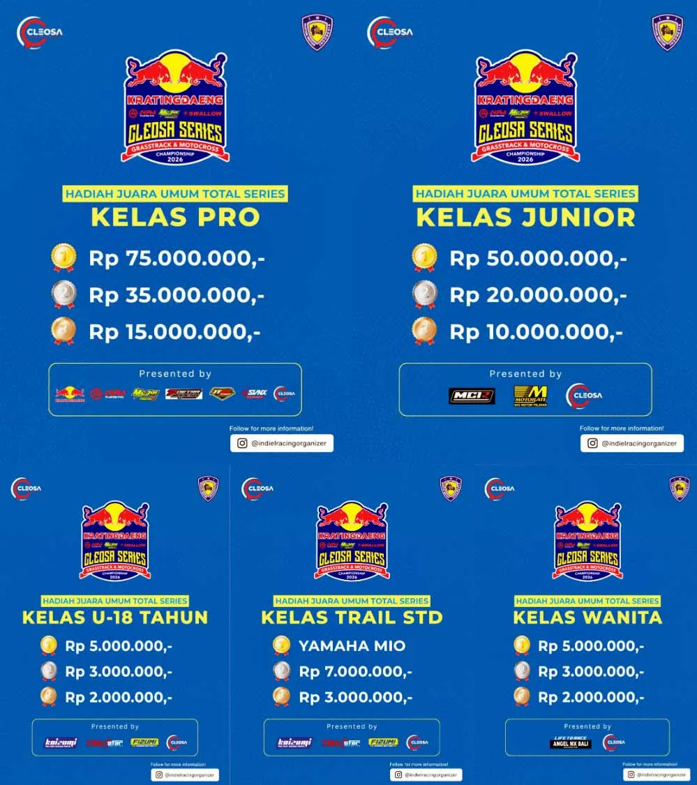 Lanjut soal hadiah. Di Cleosa Series 2026 ini kategori Pro yang awalnya peringkat pertama mendapatkan mobil diganti dengan uang tunai saja. Itu kesepakatan para bos tim yang hadir.
