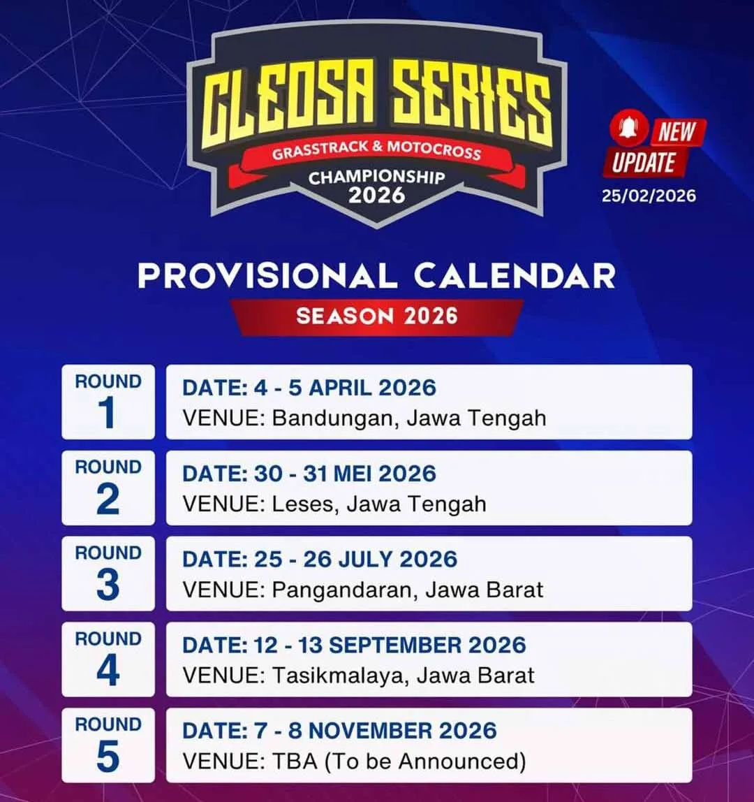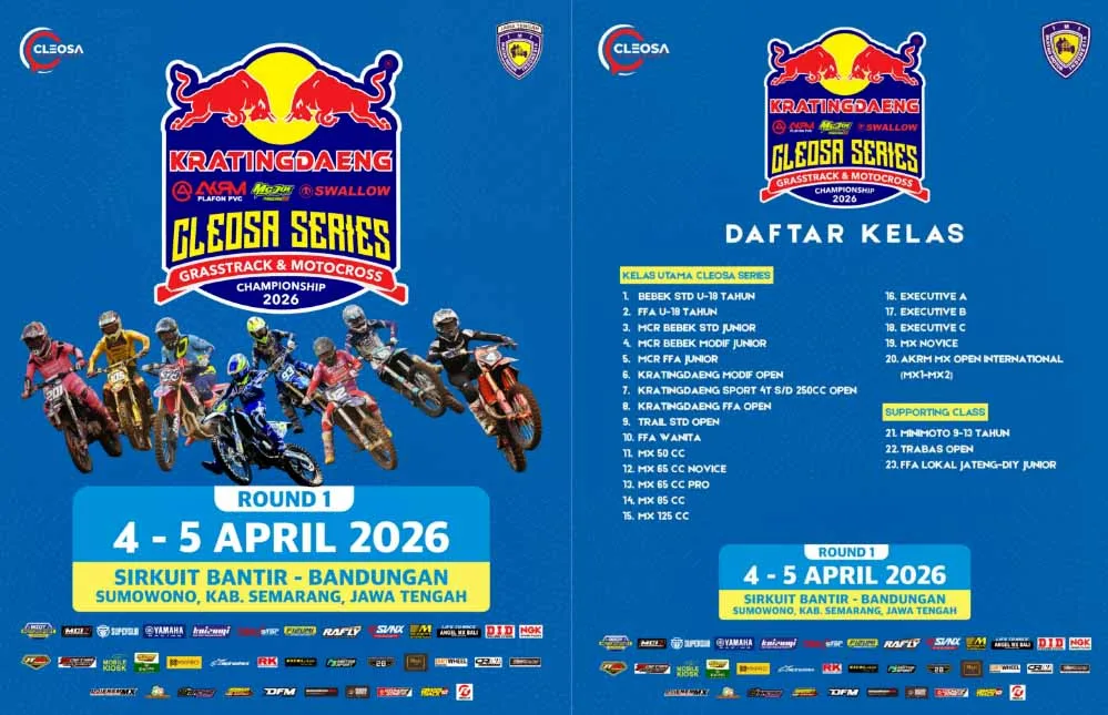 Disisi lain, Cleosa Series 2026 juga membuka kelas MX Open Internasional. Ini kelas boleh diikuti pembalap luar negeri. Yang penting harus registrasi dari awal untuk syarat proses ke IMI dan FIM.