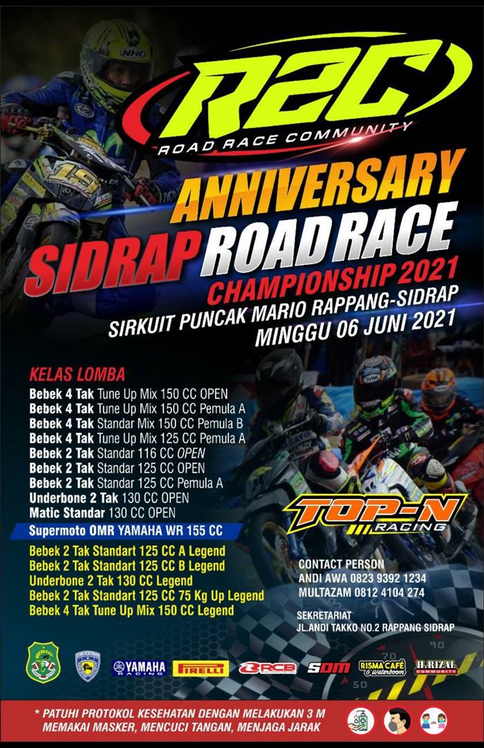 Event ini bakal dilaksanakan dengan prokes Yang sangat ketat untuk seluruh peserta dan tim wajib mengikuti prokes sesuai aturan yg di berikan oleh panitia penyelenggara. Event R2C ANNIVERSARY SIDRAP ROADRACE CHAMPIONSHIP 2021 sekaligus untuk memperingati ulang tahun R2C yang ke-2.