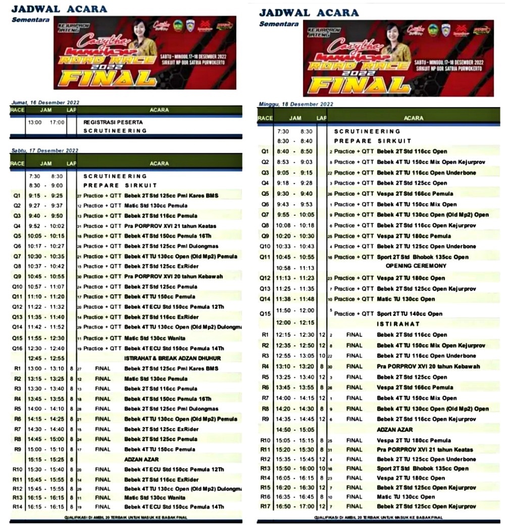 Nah, pada partai pamungkas ini sirkuit NP. GOR Satria Purwokerto akan menjadi saksi penobatan juara umum untuk musim ini. Hadiah 2 unit sepeda motor baru pun telah disiapkan oleh Manahadap Management selaku penyelenggara.