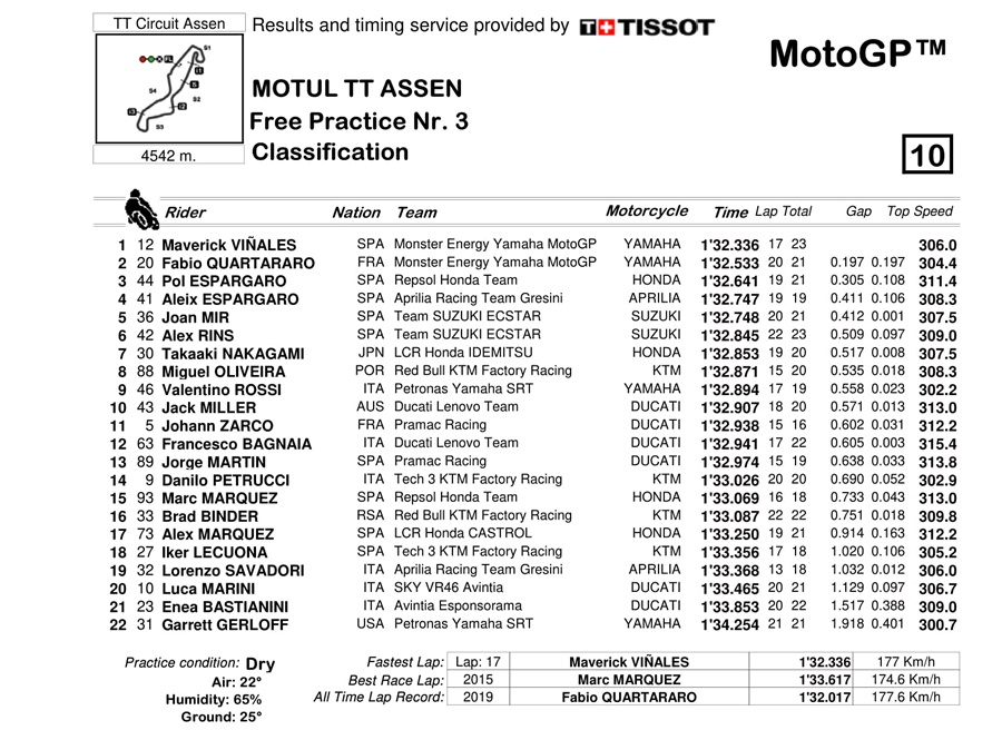 Sementara Fabio Quartararo menyusul dibelakang Vinales dengan time terbaik 1’32.533s. Kedua Yamaha M1 terbukti ampuh dengan posisi terdepan di FP3 yang berlangsung dalam kondisi kering.