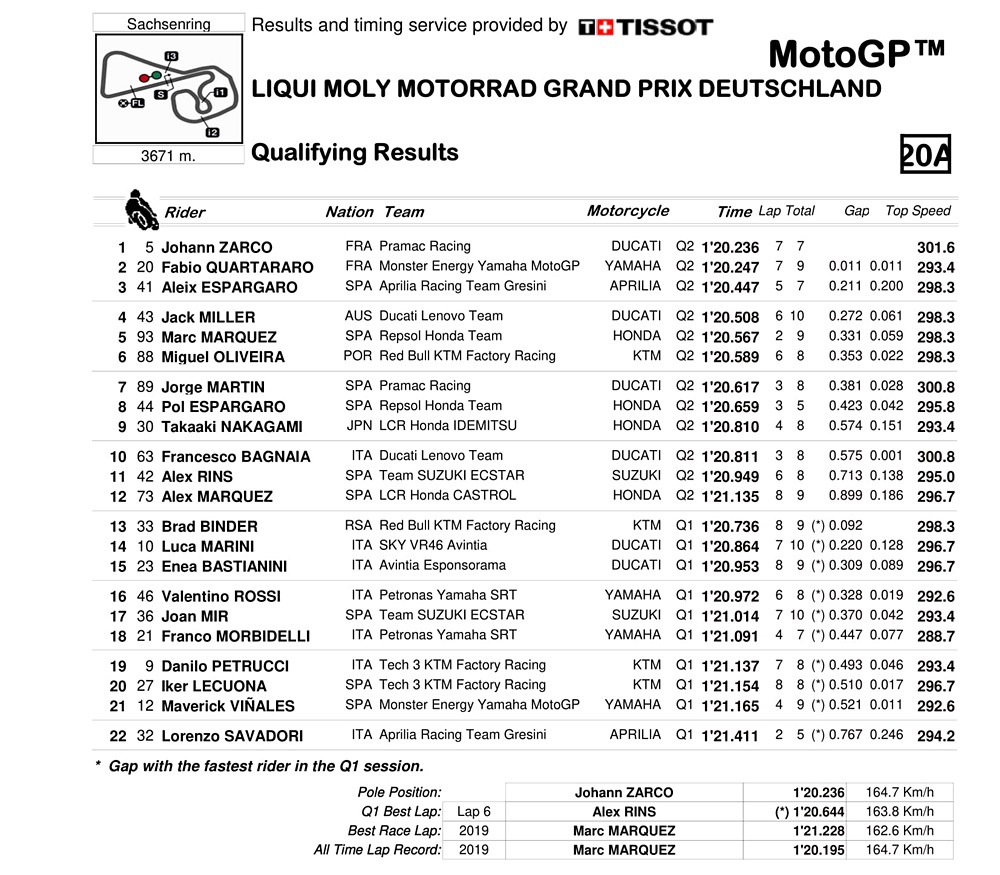 “Sangat pentint di Sachsenring untuk berada di barisan depan. Karena menyalip bukanlah permainan anak-anak di sini. Saya sangat senang bisa menyenangkan tim Aprilia hari ini. Kami sekarang menunjukkan kepada semua orang bahwa Aprilia akan menjadi motor yang serius. Kami berkembang dan semakin dekat dengan pembalap top. Mampu meninggalkan barisan depan besok akan membuat hidup saya sedikit lebih mudah,” tambahnya.