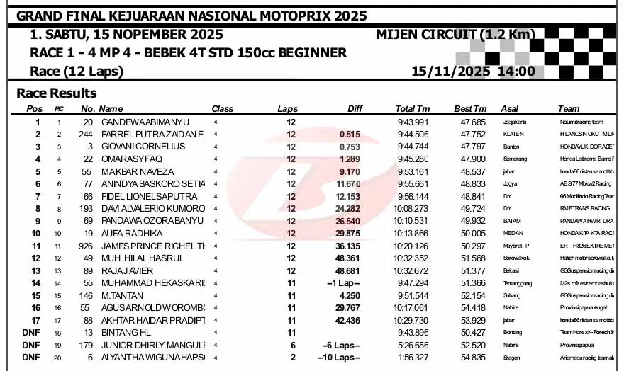 BalapMotor.Net – Gandewo Abimanyu sukses mengamankan podium juara Race 1 MP4 Beginner di Grand Final Motoprix yang berlangsung di sirkuit Mijen, Semarang (15/11).