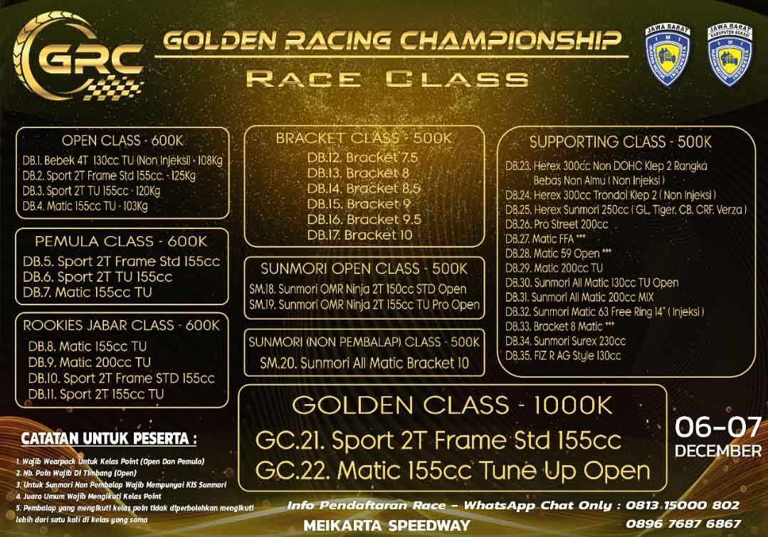 Nah, Golden Racing Championship sendiri akan melombakan banyak kelas. Mulai dari kategori Golden Class, lanjut ada kategori open, pemula, rookies Jabar, Sunmory, braket dan pendukung lainnya.