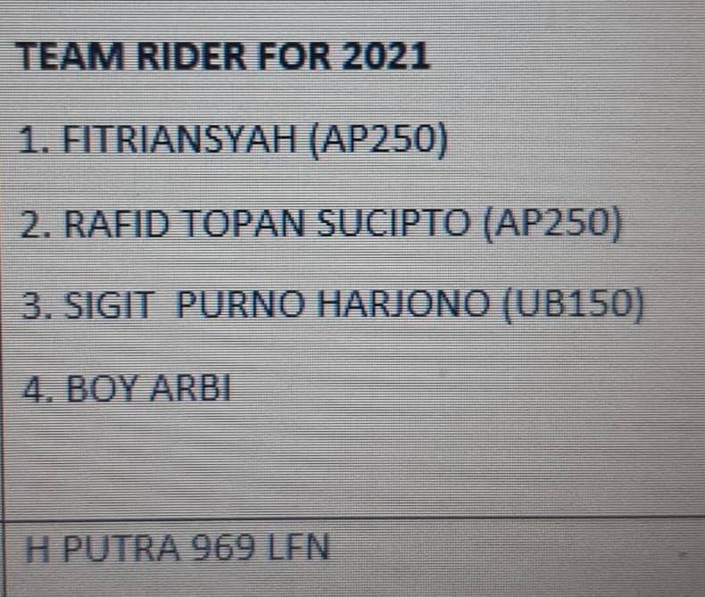“Resmi : Line up untuk 2021 H Putra 969 Racing Team, Fitriansyah Kete akan kembali tarung, lalu Rafid Topan Sucipto yang selalu membuat warna, Sigit Purno Harjono dan Boy Arbi. Tidak sabar untuk menonton quartet ini beraksi di tahun ini,” begitulah postingan dari ARRC.