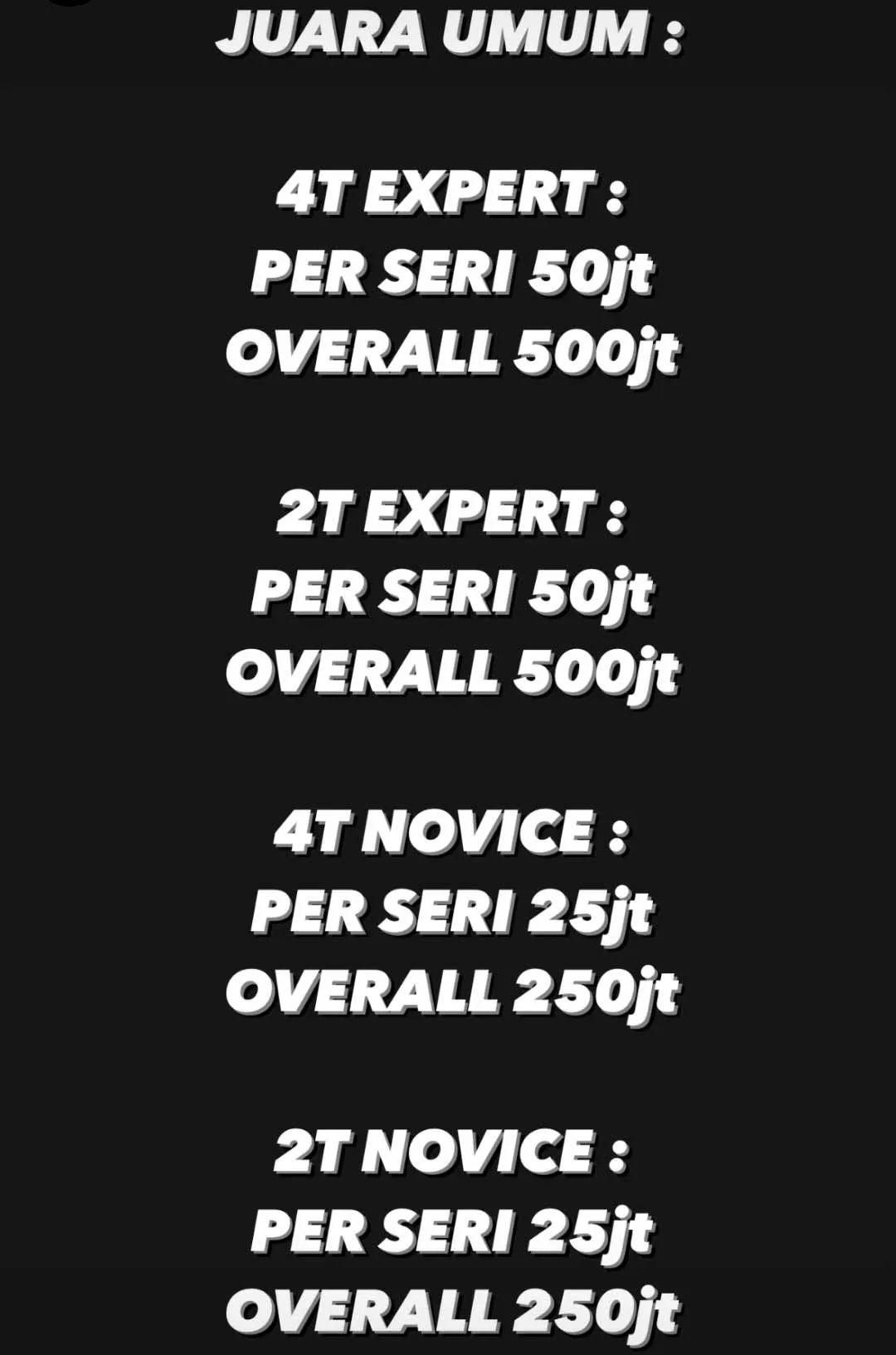 Nah, selain itu juara umum setiap seri juga gak ada obatnya. Expert baik 4 tak maupun 2 tak masing-masing dapat 50 juta. Sementara novice masing-masing 25 juta. Jos!!
