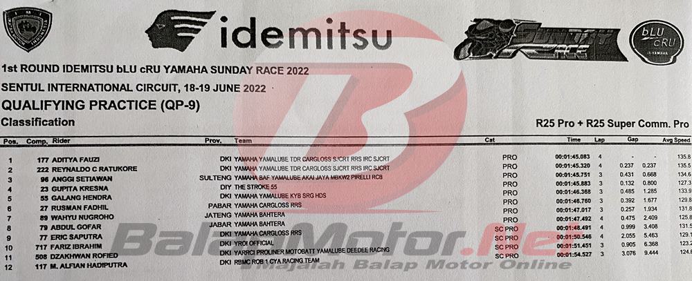 BalapMotor.Net – Pembalap muda asal Tasikmalaya Aditya Fauzi berhasil menjadi yang terbaik pada kelas utama R25 Pro gelaran perdana Idemitsu bLU cRU Yamaha Sunday Race 2022 yang digelar di sirkuit Sentul Internasional, Bogor (11/6).