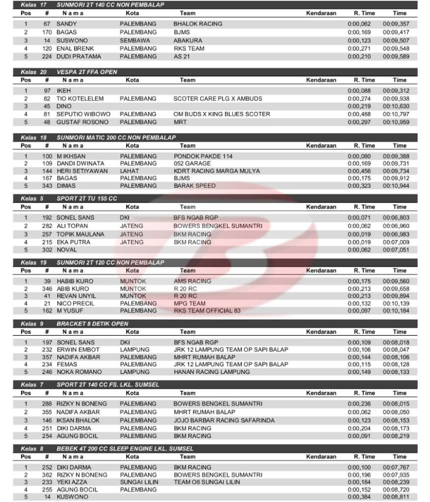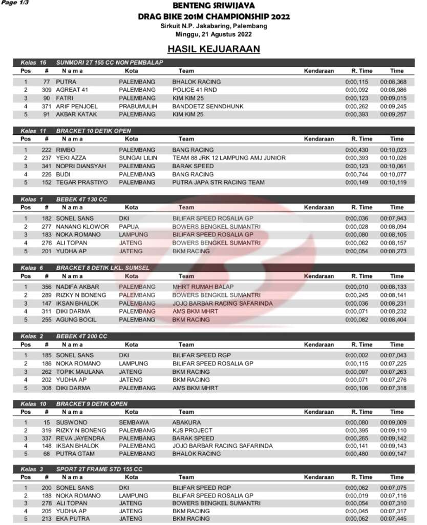 BalapMotor.Net – Berikut kami paparkan hasil kejuaraan Benteng Sriwijaya Dragbike 201 Championship yang berlangsung di sirkuit NP. Jakabaring, Palembang, Sumsel pada Minggu 21 Agustus 2022.