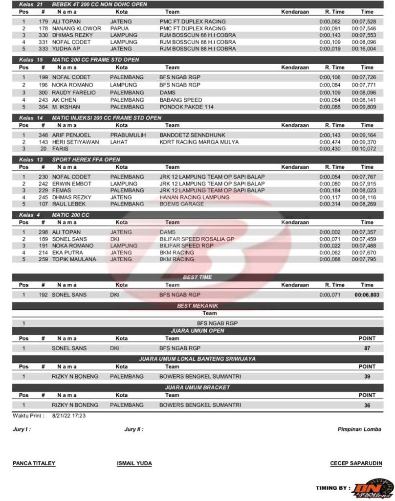 Hasil Benteng Sriwijaya Drag Bike Palembang 21 Agustus 2022