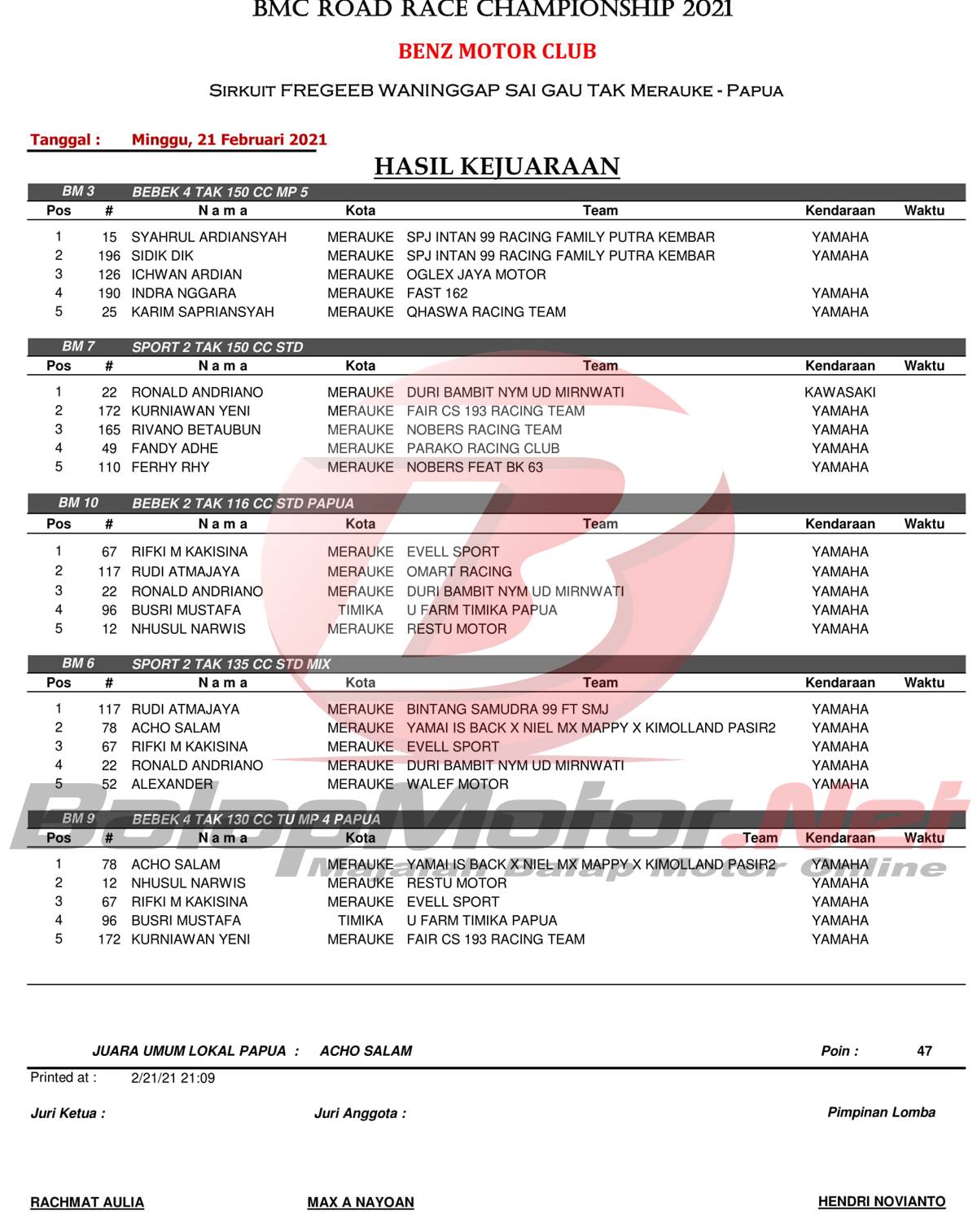 BalapMotor.Net – Berikut merupakan hasil lomba dari gelaran BMC Road Race Championship 2021 yang berlangsung di sirkuit permanen Fregeen Waningap Sai Gau Tak – Merauke, Papua pada 21 Februari 2021.