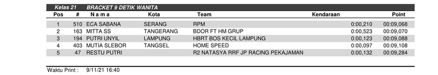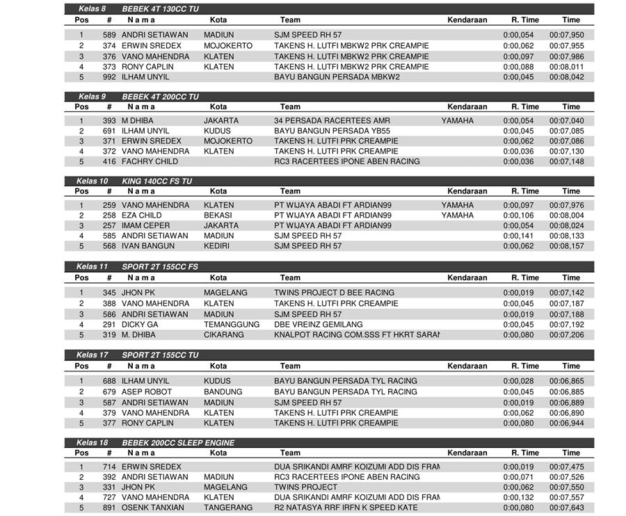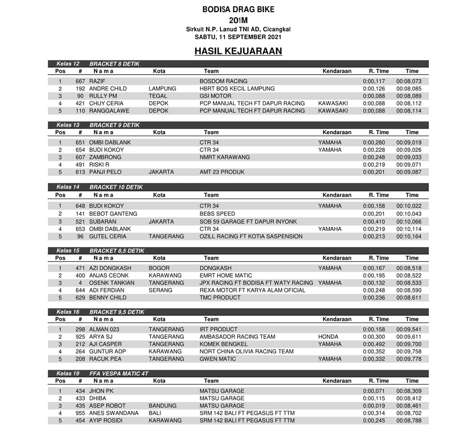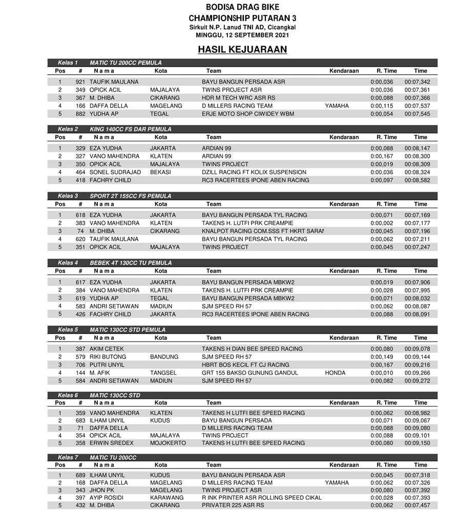 BalapMotor.Net – Berikut kami paparkan hasil kejuaraan balap lurus 201m bertajuk Bodisa Drag Bike Championship putaran ketiga yang berlangsung di sirkuit NP. Lanud Cicangkal, Banten (11-12 September).