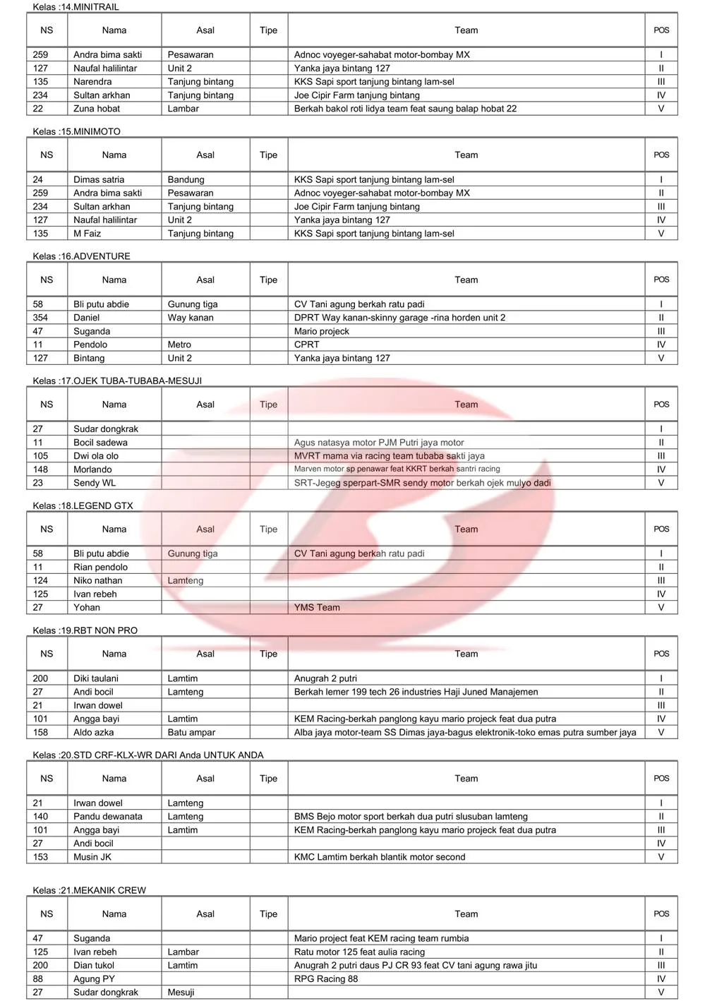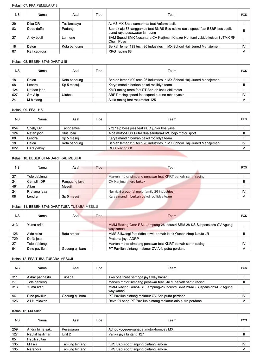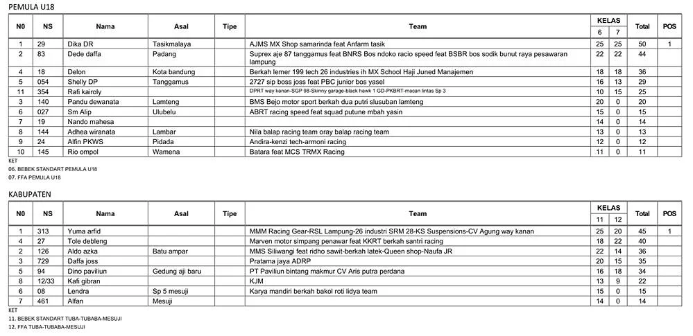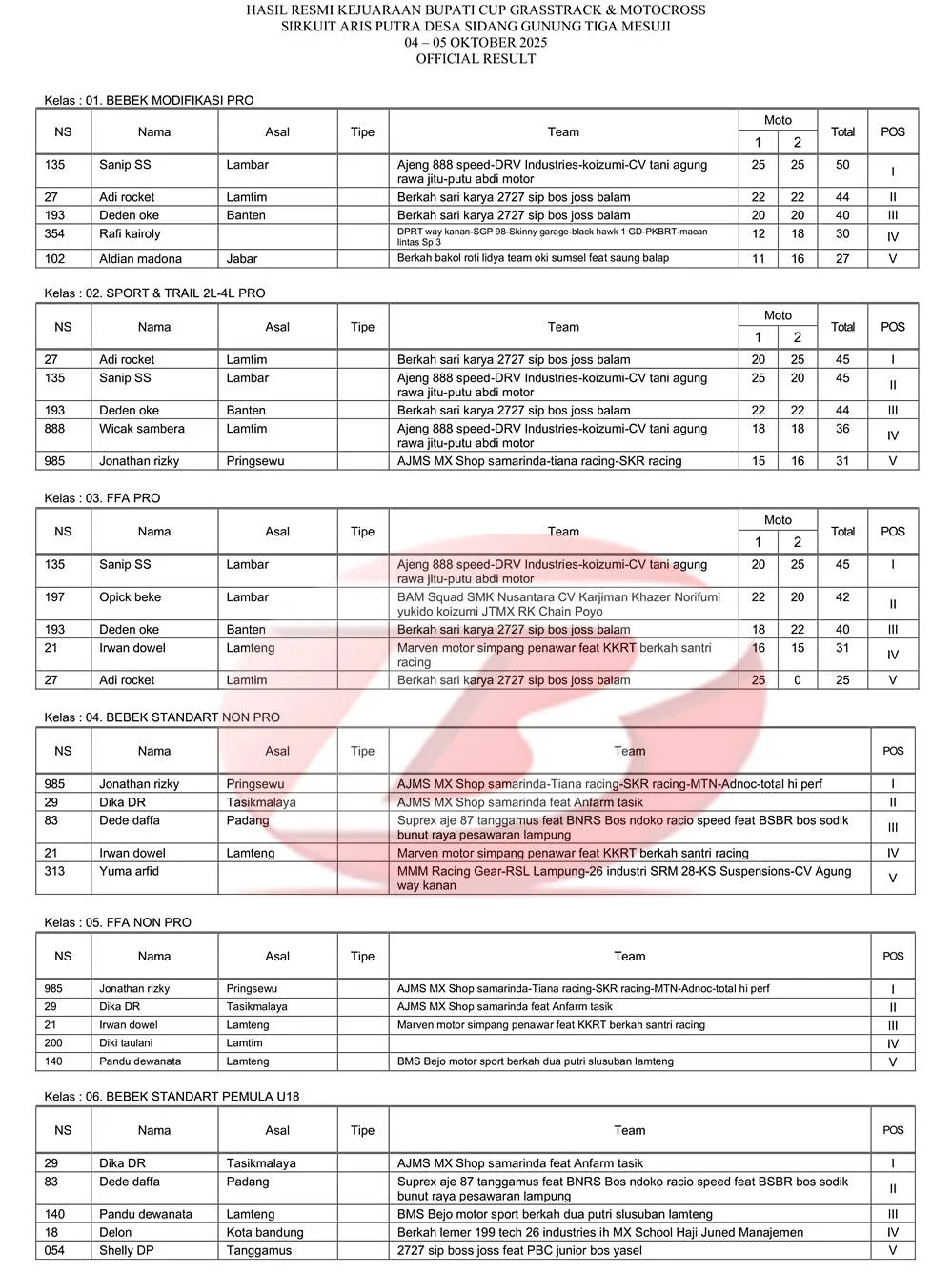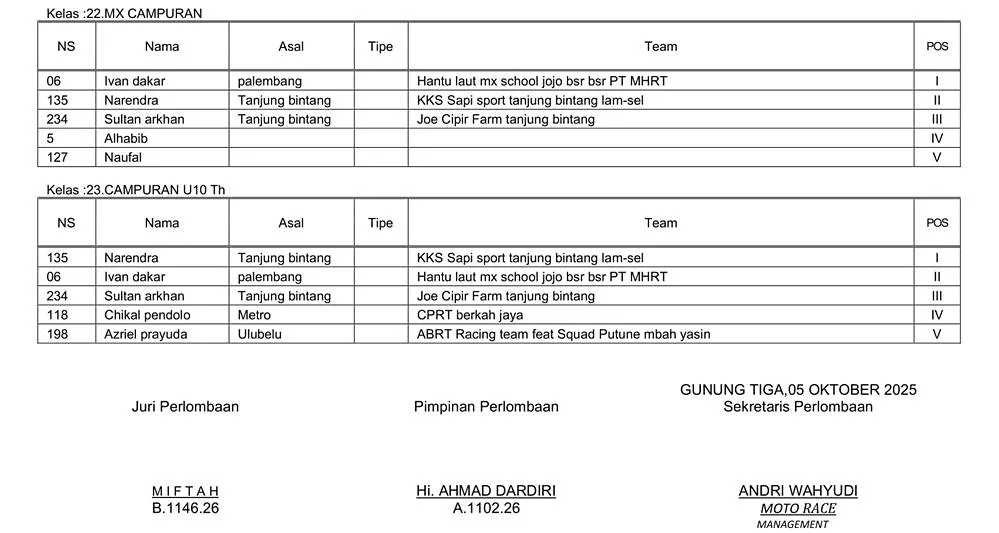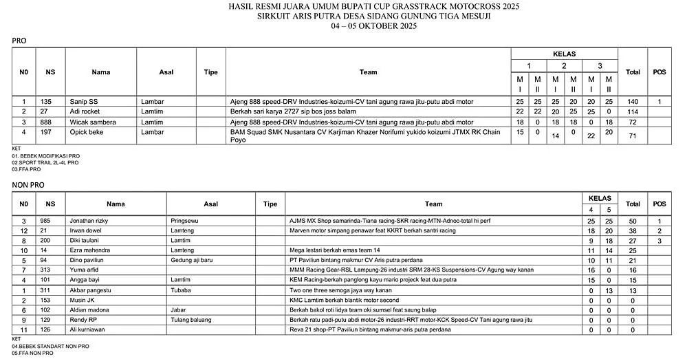 BalapMotor.Net  – Berikut merupakan hasil lengkap kejuaraan balap garuk tanah Bupati Cup Grasstrack & Motocross yang berlangsung di sirkuit Aris Putra, Desa Sidang Gunung Tiga, Mesuji pada 4-5 Oktober 2025. (**)