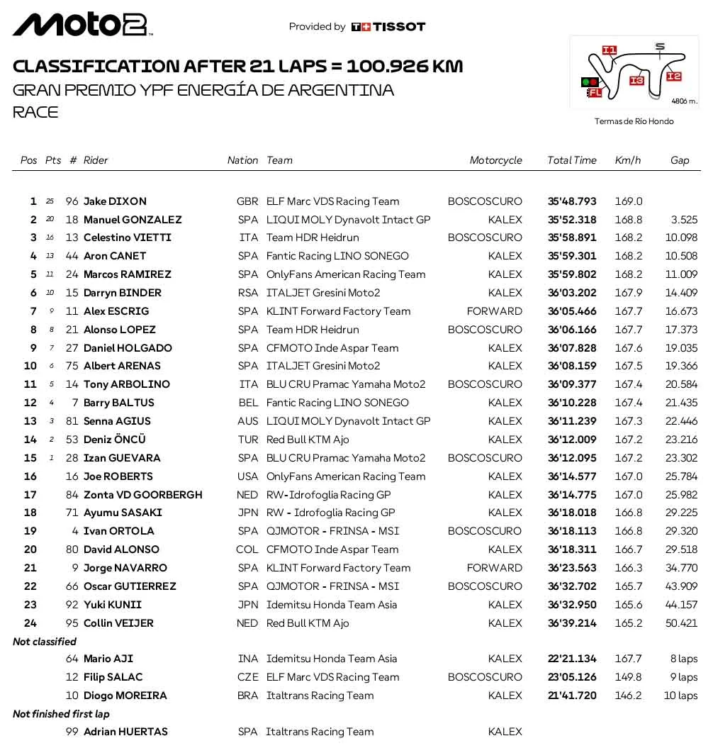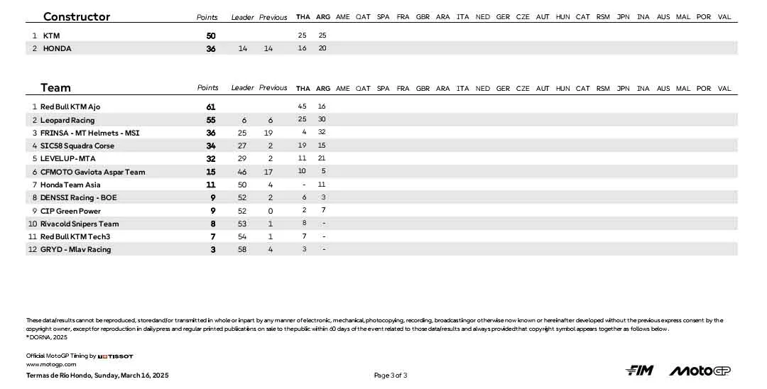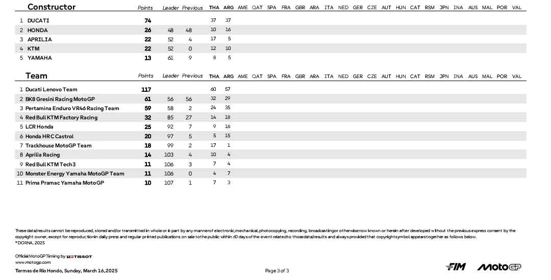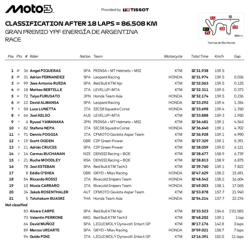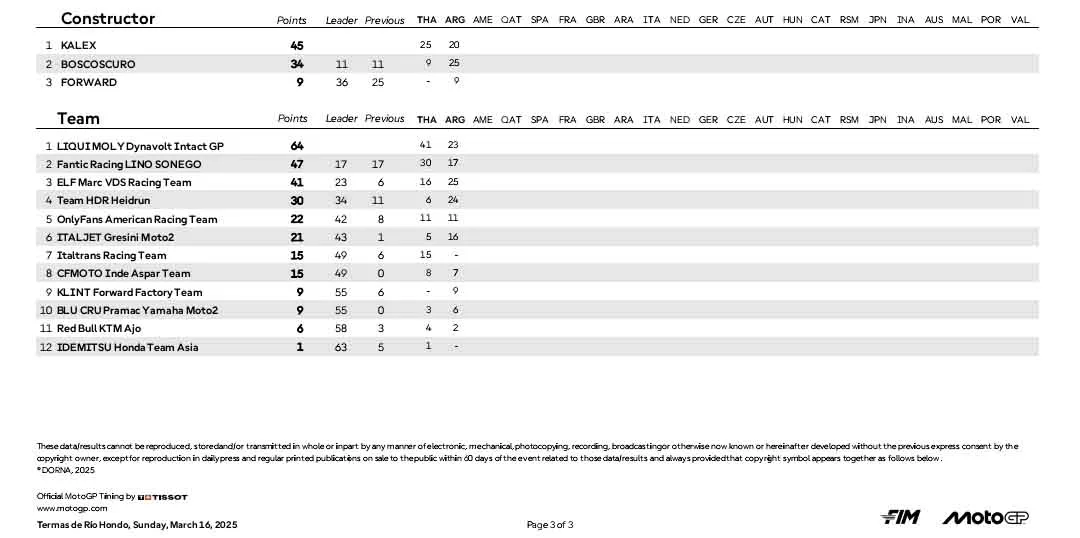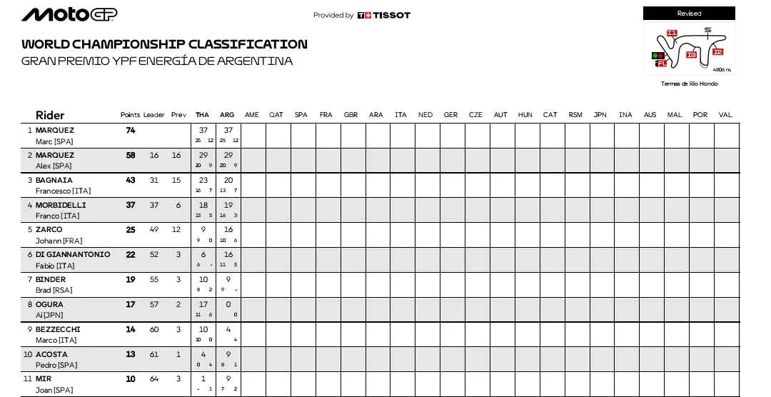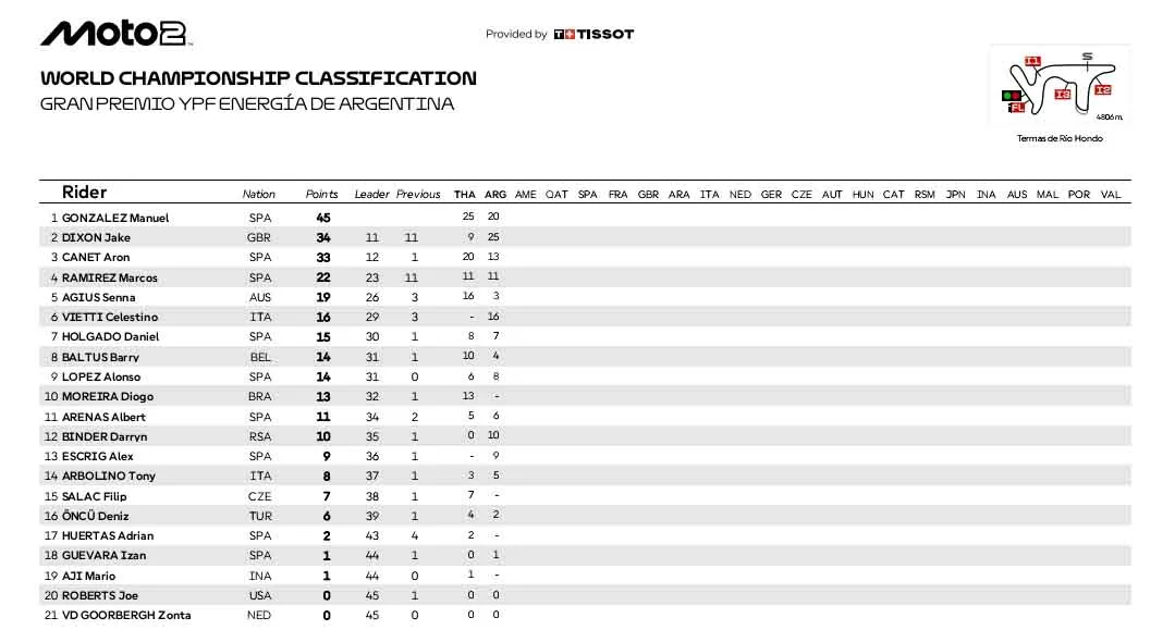 BalapMotor.Net – Berikut merupakan hasil lengkap Kejuaraan Dunia MotoGP, Moto2 dan Moto3 serta klasemen sementara setelah putaran kedua yang berlangsung di sirkuit Termas de Rio Hondo, Argentina. (**)