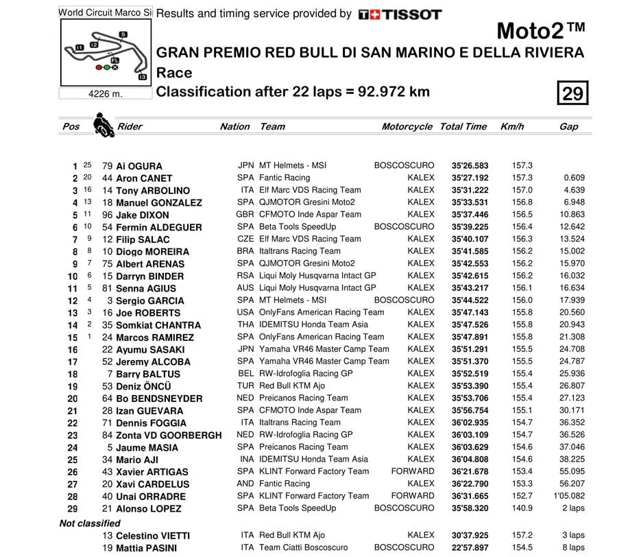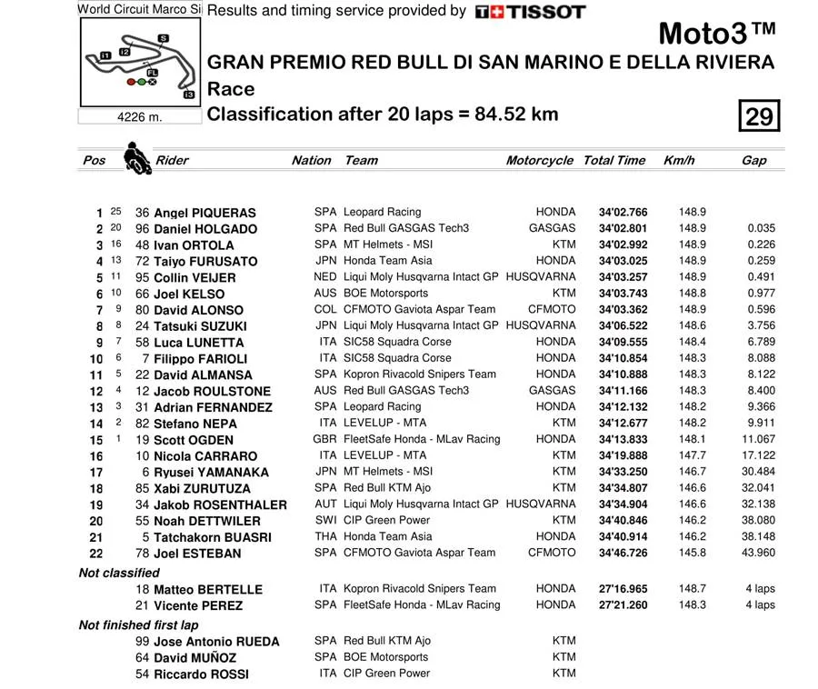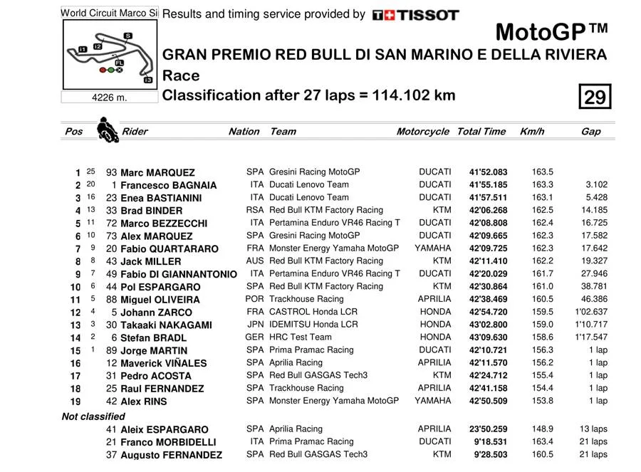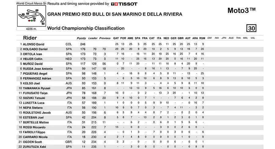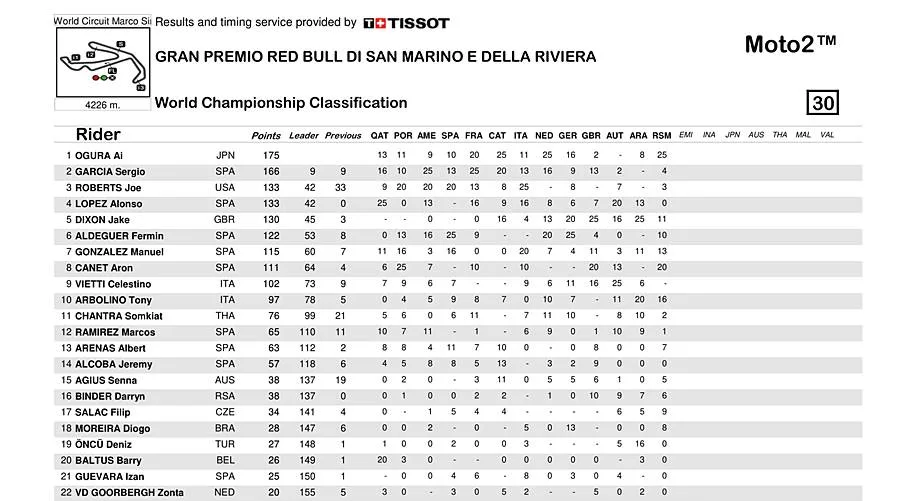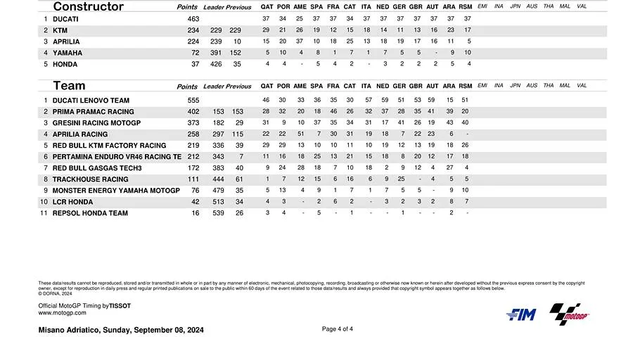 BalapMotor.Net  – Berikut merupakan hasil dan klasemen sementara kejuaraan dunia MotoGP, Moto2 dan Moto3 setelah menyelesaikan putaran ke-13 yang berlangsung di Misano World Circuit Marco Simoncelli pada 6-8 September 2024. (***)