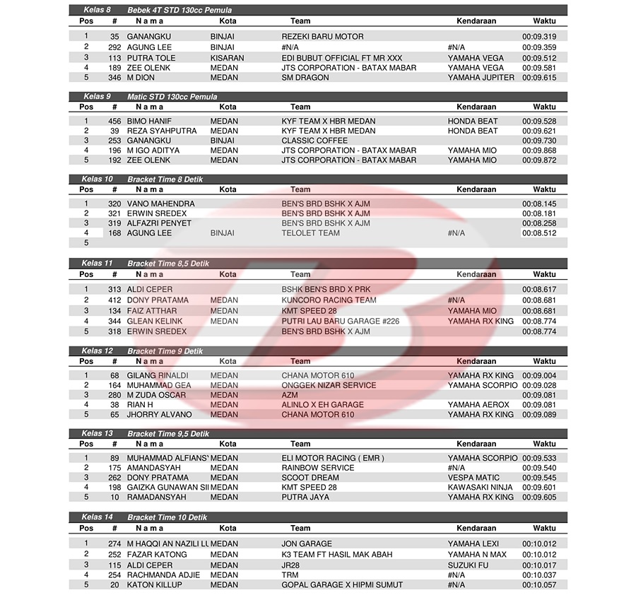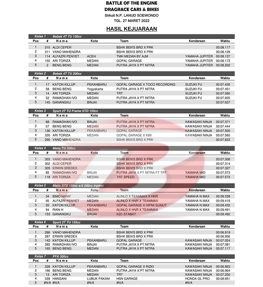 BalapMotor.Net – Berikut kami paparkan hasil kejuaraan Battle Of The Engine Dragrace Cars & Bikes yang berlangsung akhir pekan kemarin (27-Maret) di sirkuit N.P Lanud Soewondo, Kota Medan.