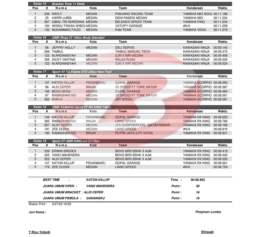 Hasil Drag Bike Lanud Soewondo Medan 27 Maret 2022