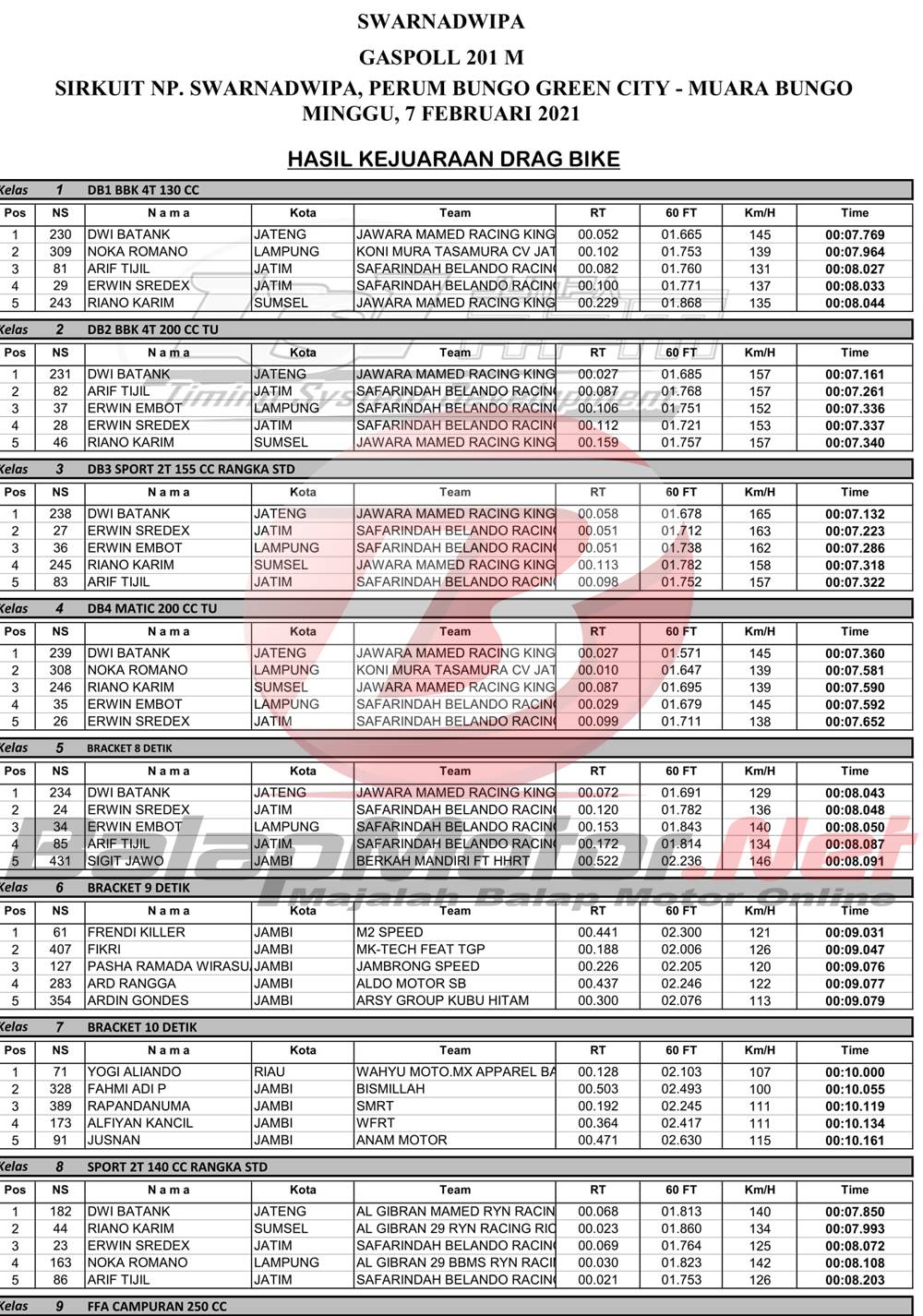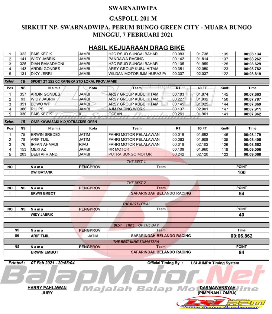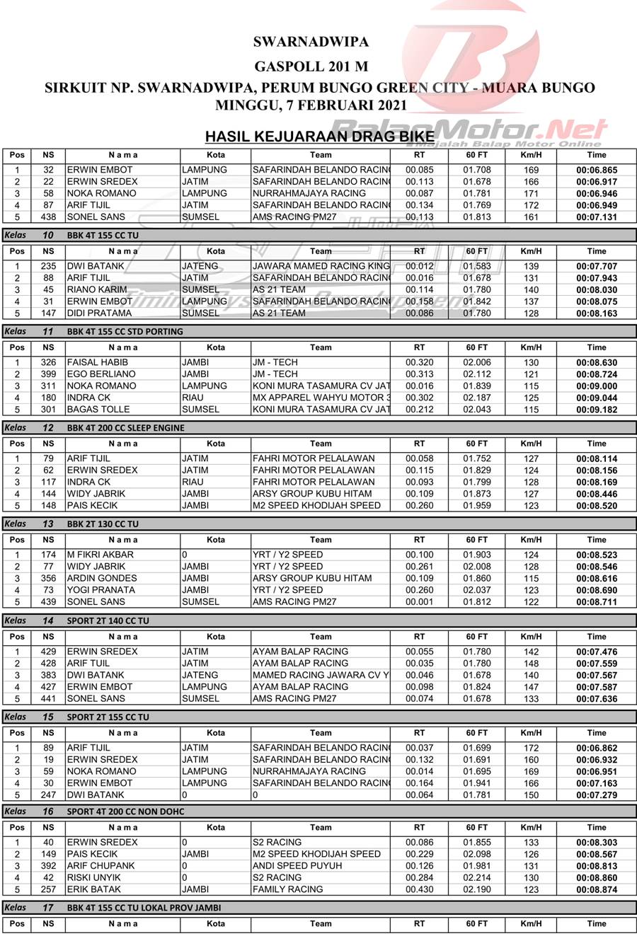 BalapMotor.Net – Berikut merupakan hasil dari gelaran Swarnadwipa Gaspoll 201M Drag Bike yang berlangsung di sirkuit NP Swarnadwipa, Perum Bungo Green City – Muaro Bungo, Jambi pada 7 Februari 2021. | Budy