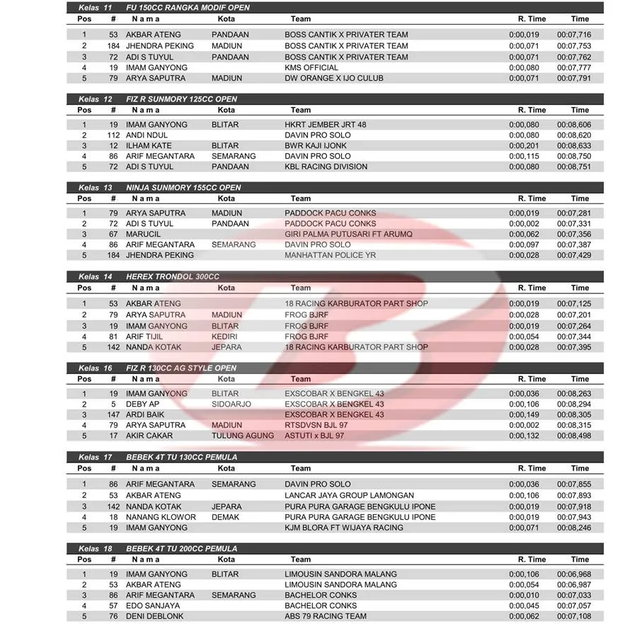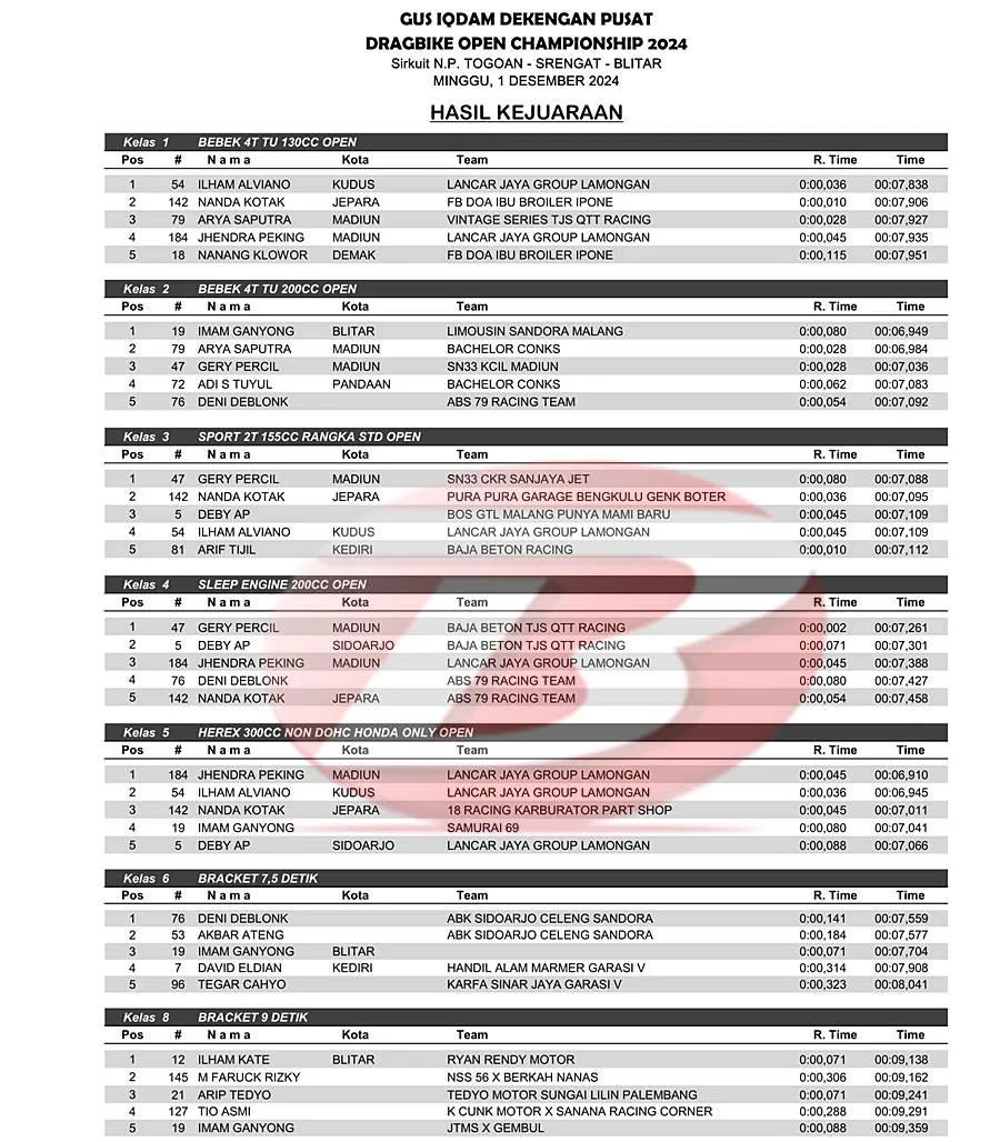 BalapMotor.Net – Berikut merupakan hasil lengkap kejuaraan balap lurus dengan tajuk Gus Iqdam Dekengan Pusat – Drag Bike Open Championship yang berlangsung di sirkuit NP. Togoan Srengat, Blitar, Jawa Timur pada Minggu 1 Desember 2024. (***)