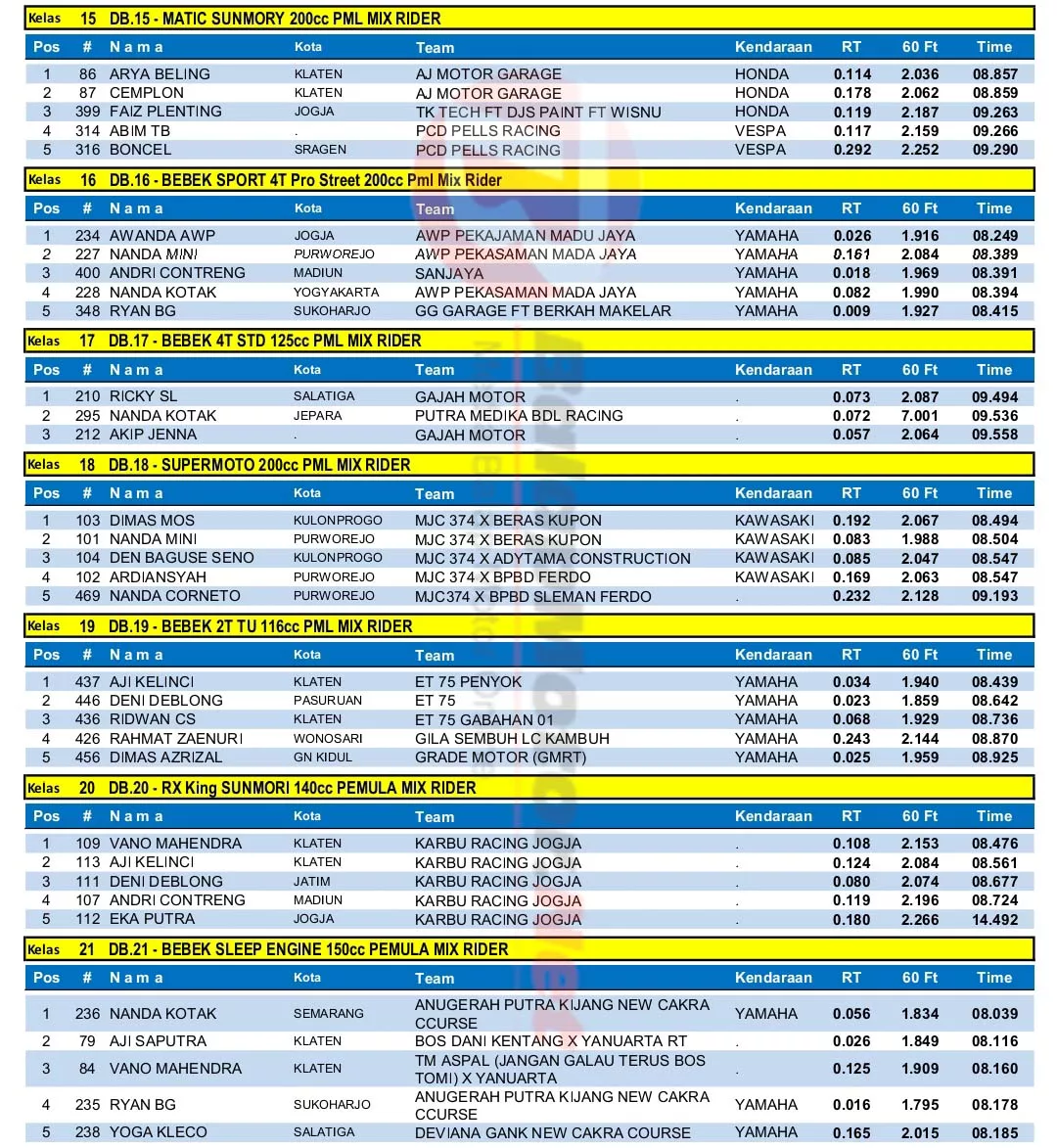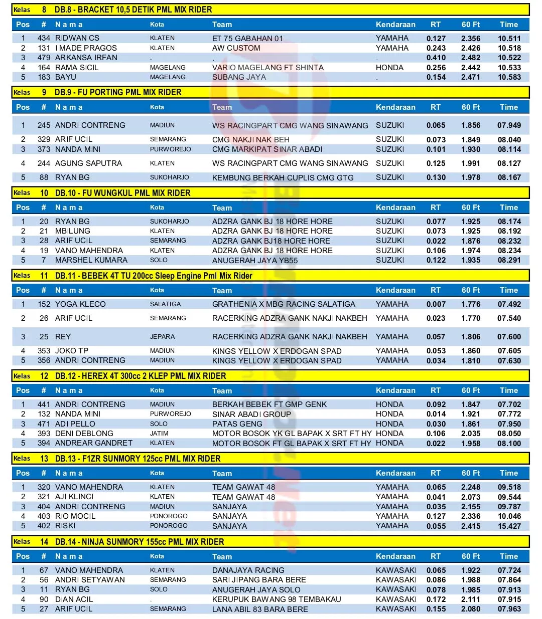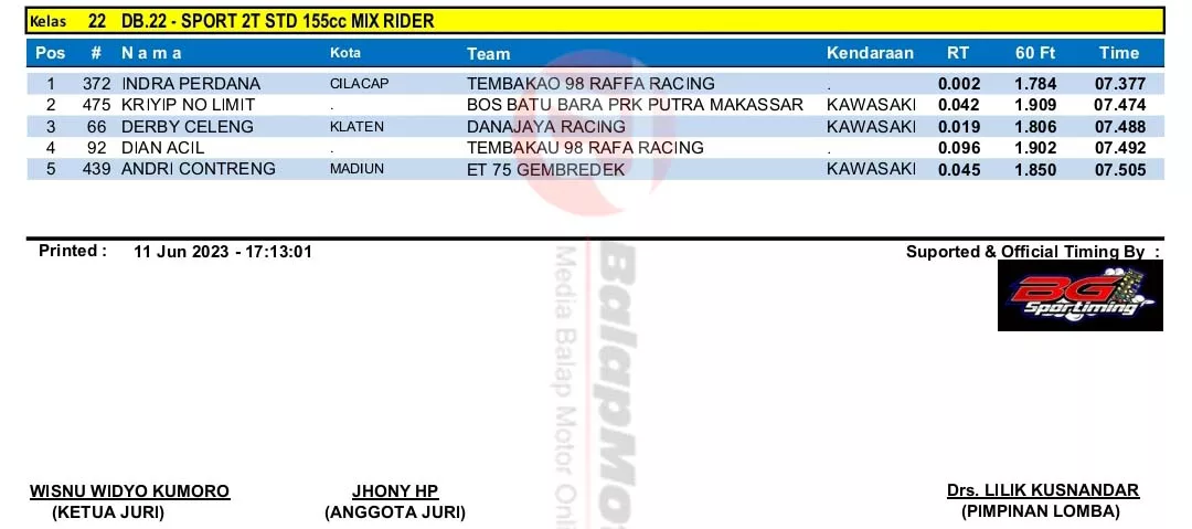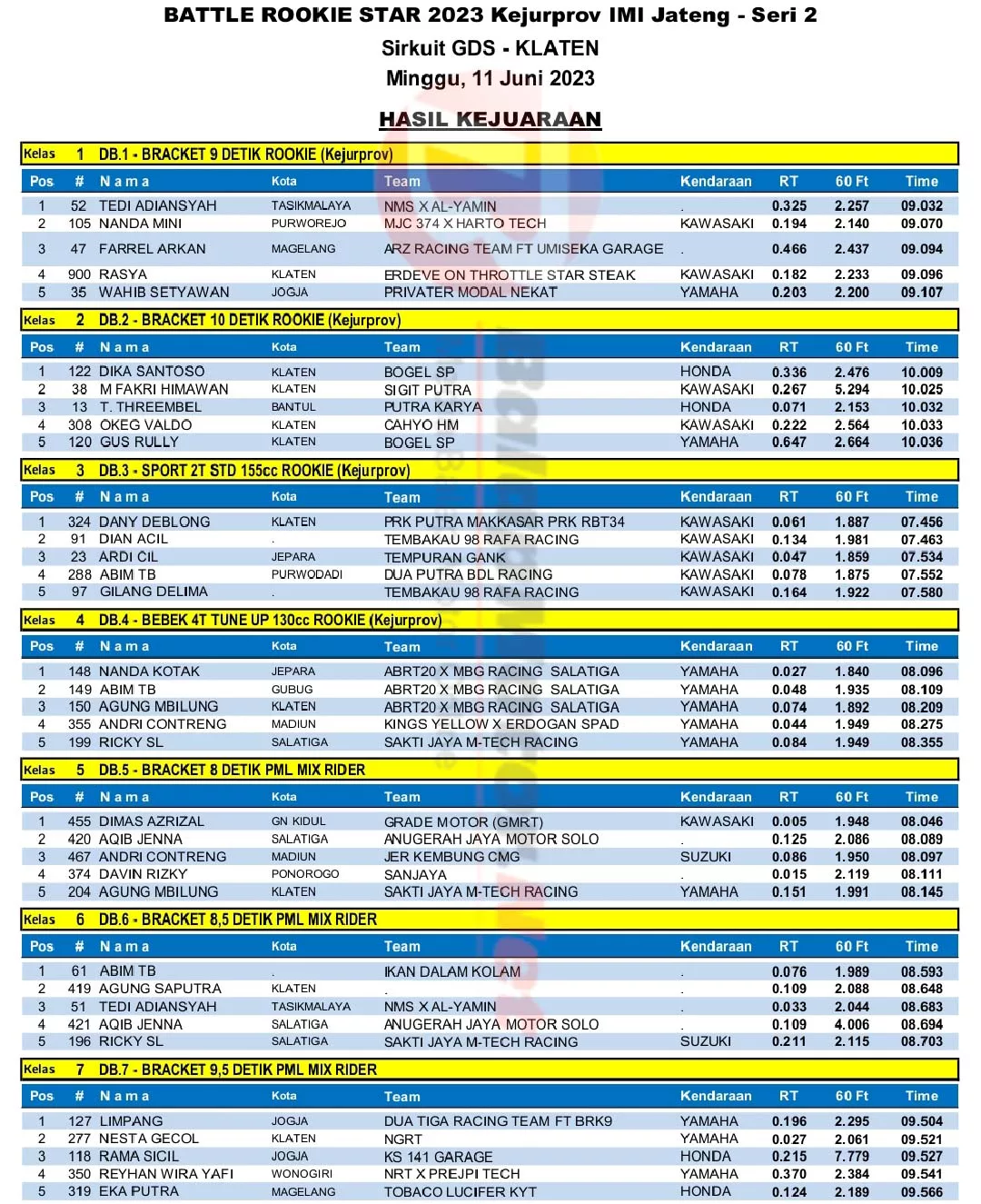 BalapMotor.Net – Berikut merupakan hasil kejuaraan balap lurus bertajuk Kejurprov IMI Jateng Drag Bike Rookie Star Battle 2023 putaran kedua yang berlangsung di sirkuit Gantiwarno Drag Strip (GDS) Klaten pada Minggu 11 Juni 2023. (***)