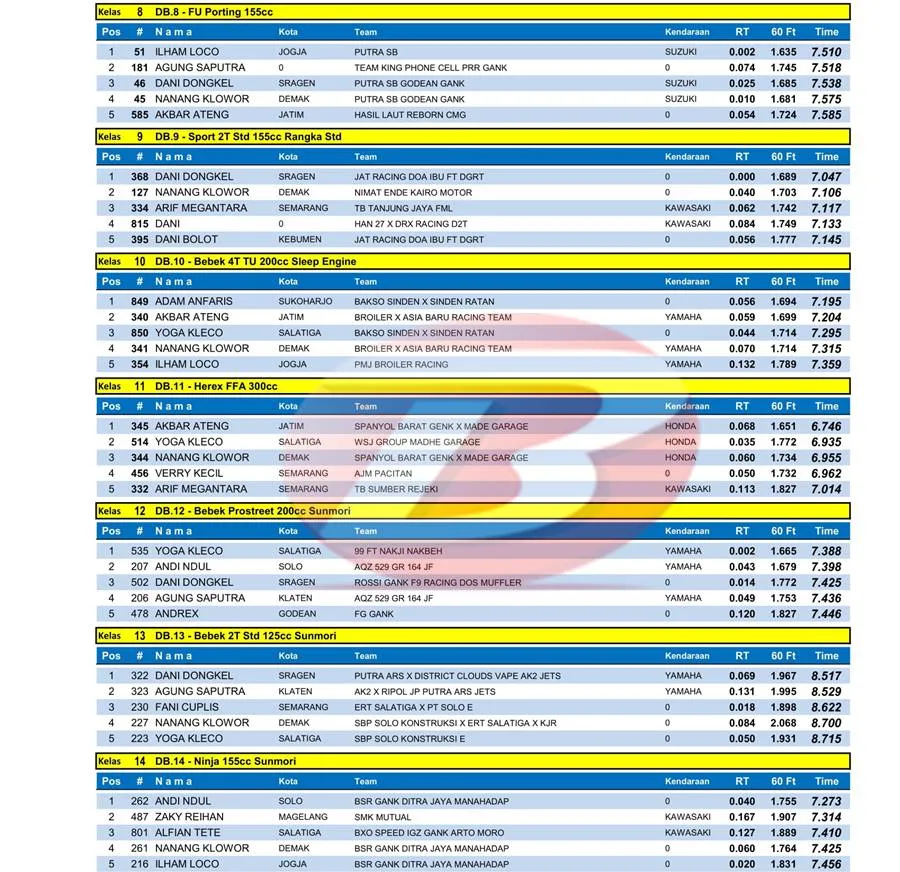 BalapMotor.Net – Berikut merupkan hasil kejuaraan balap lurus bertajuk Hari Lalu Lintas ke-70 Drag Bike Championship 2025 – Youngstar Battle Novice #2 yang berlangsung di sirkuit NP. Jl. Soekarno Hatta Mungkid, Magelang, Jawa Tengah pada Minggu 14 September 2025. (**)