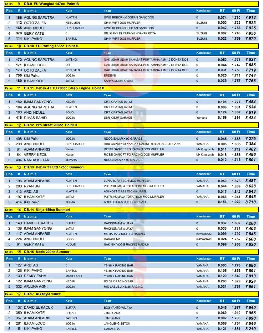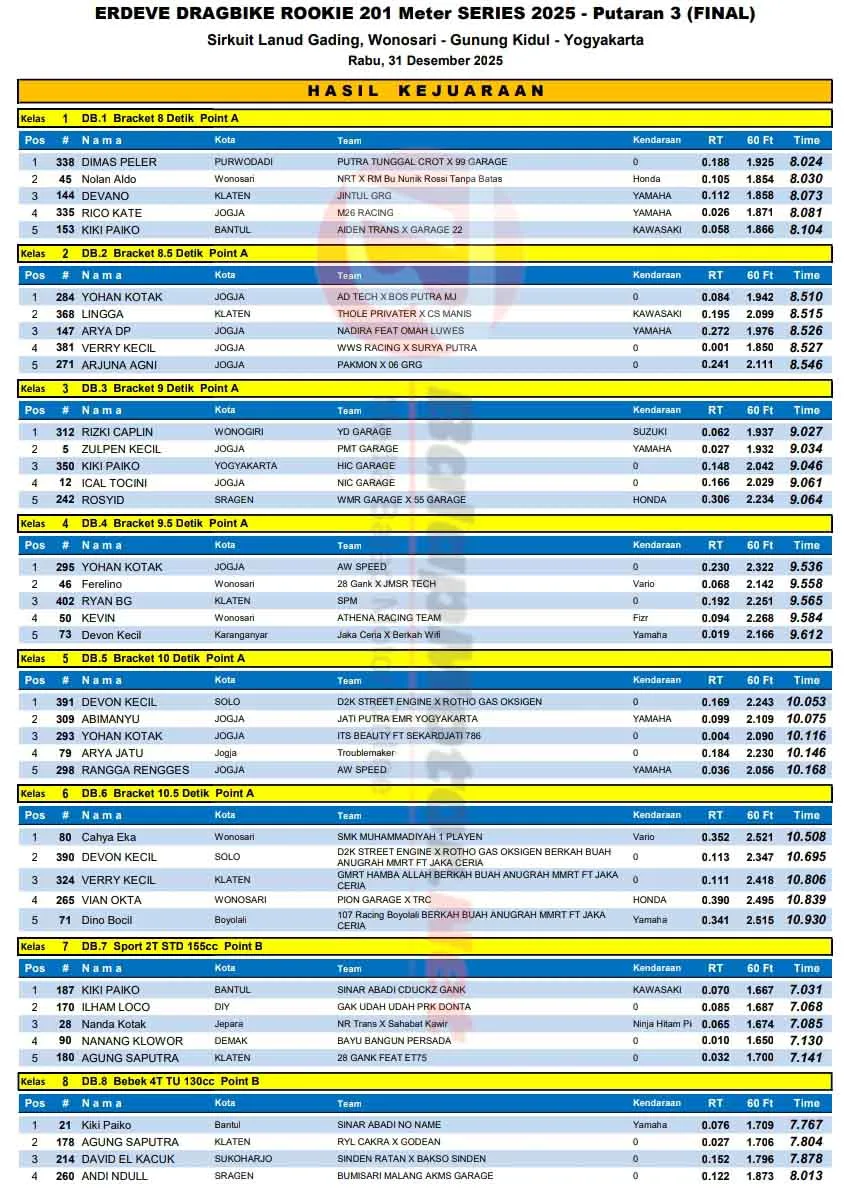 BalapMotor.Net – Berikut merupakan hasil putaran final Erdeve Drag Bike Rookie yang berlangsung di sirkuit NP. Lanud Gading, Wonosari, Yogyakarta pada Rabu 31 Desember 2025. (**)