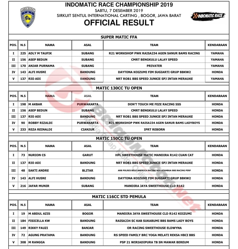 BalapMotor.Net – Berikut kami paparkan hasil Putaran final Daytona Indomatic Championship 2019 yang berlangsung di sirkuit Sentul Karting, Bogor, Jawa Barat pada 7 Desember 2019. | Yugo