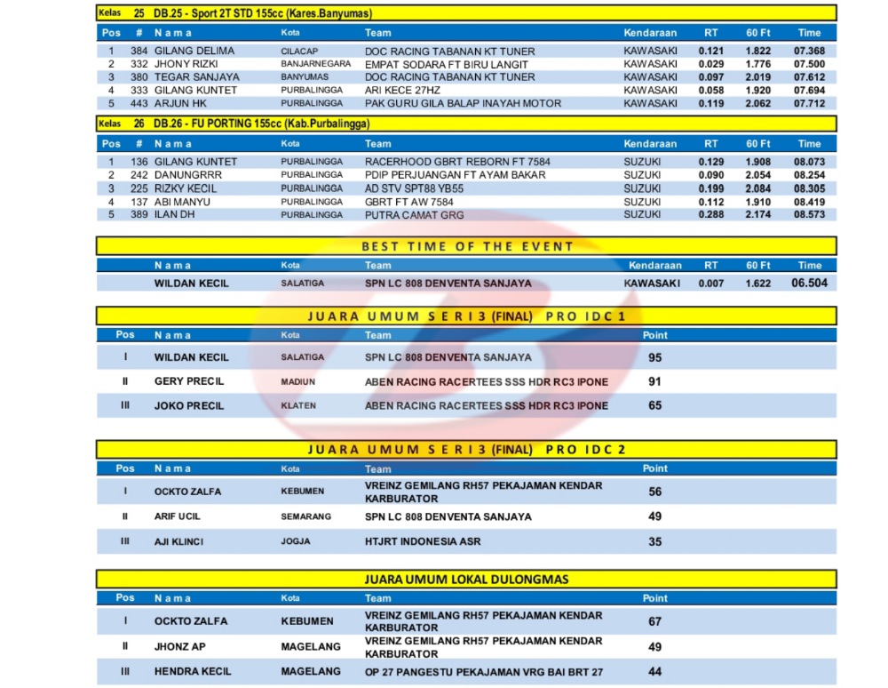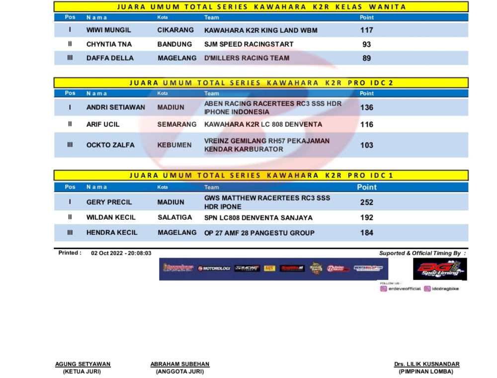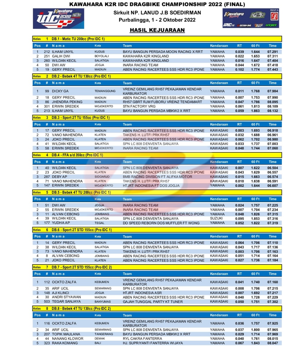 Hasil Final Kawahara K2R IDC Drag Bike Purbalingga 1-2 Oktober 2022Penulis Yugo Aol - 02/10/2022 BalapMotor.Net – Berikut kami paparkan hasil lengkap final kejuaraan balap lurus Kawahara K2R IDC Drag Bike Championship 2022 yang berlangsung sirkuit NP. Lanud J.B Soedirman, Purbalingga pada 1-2 Oktober 2022.