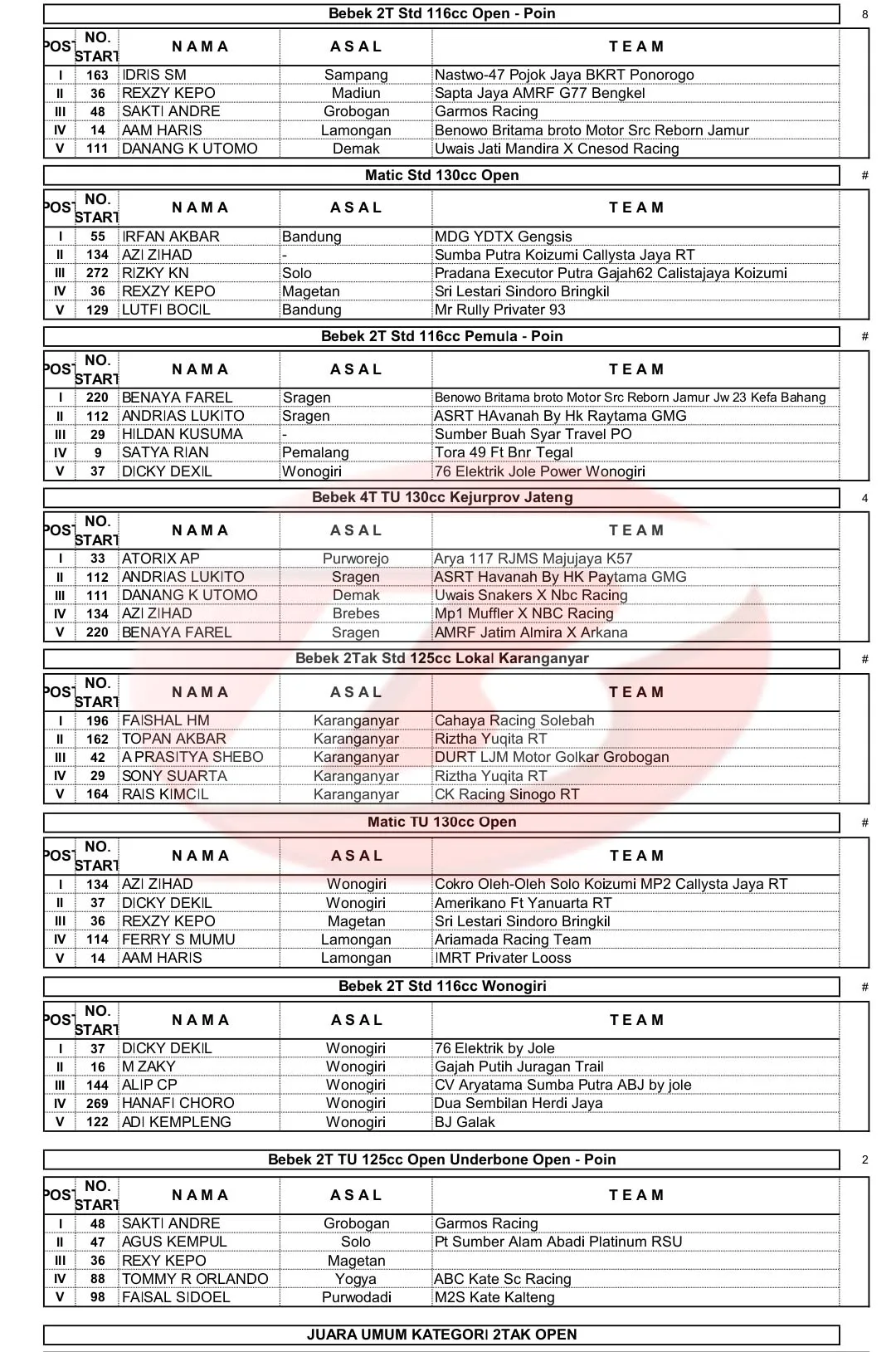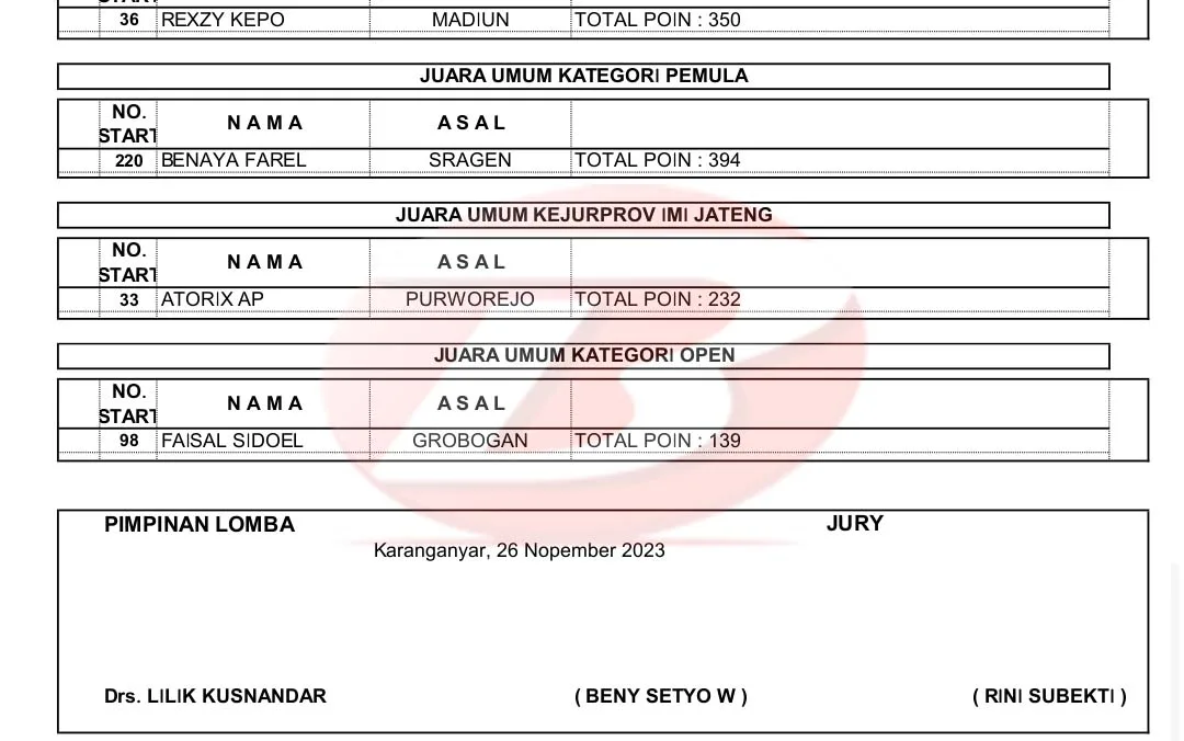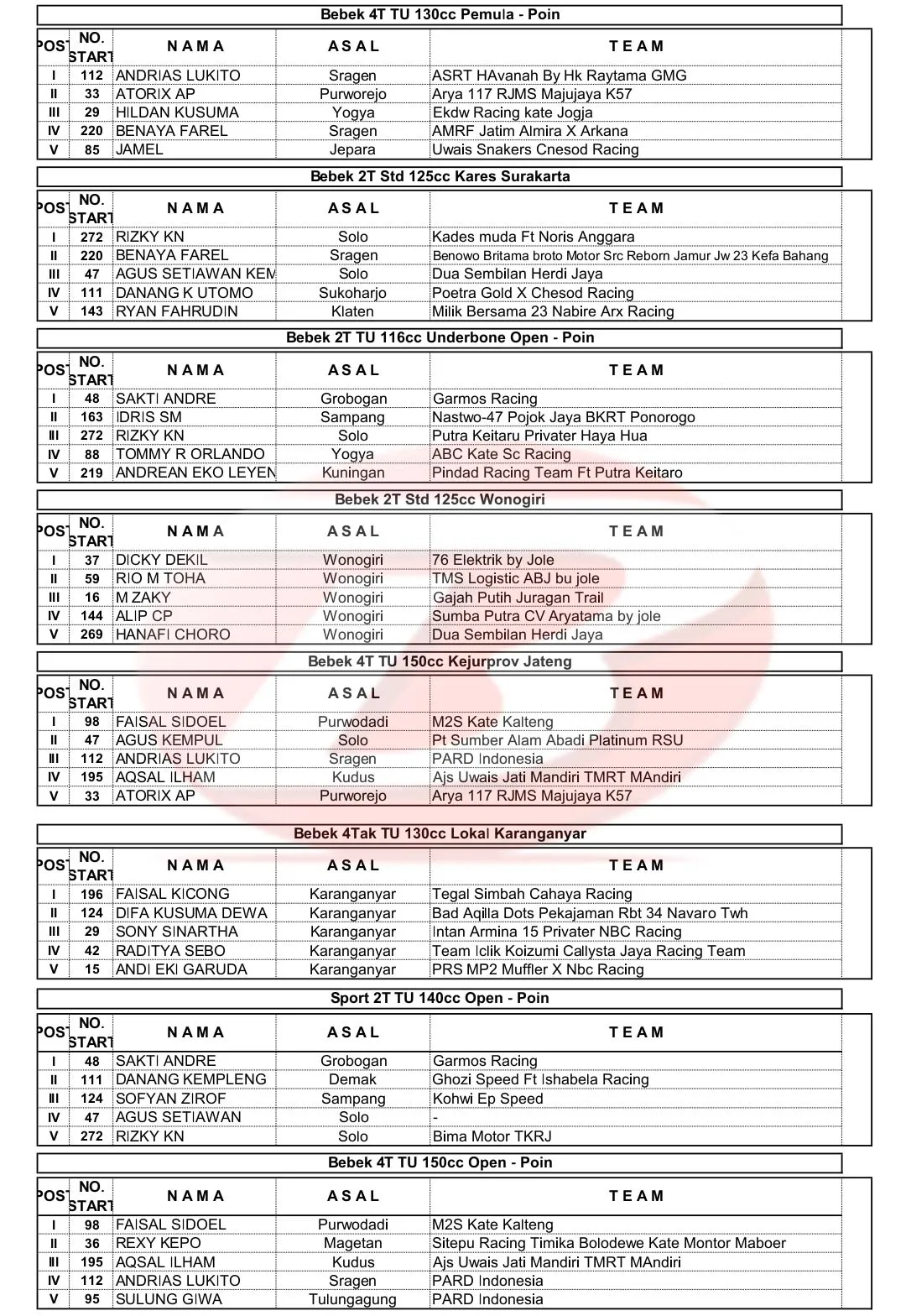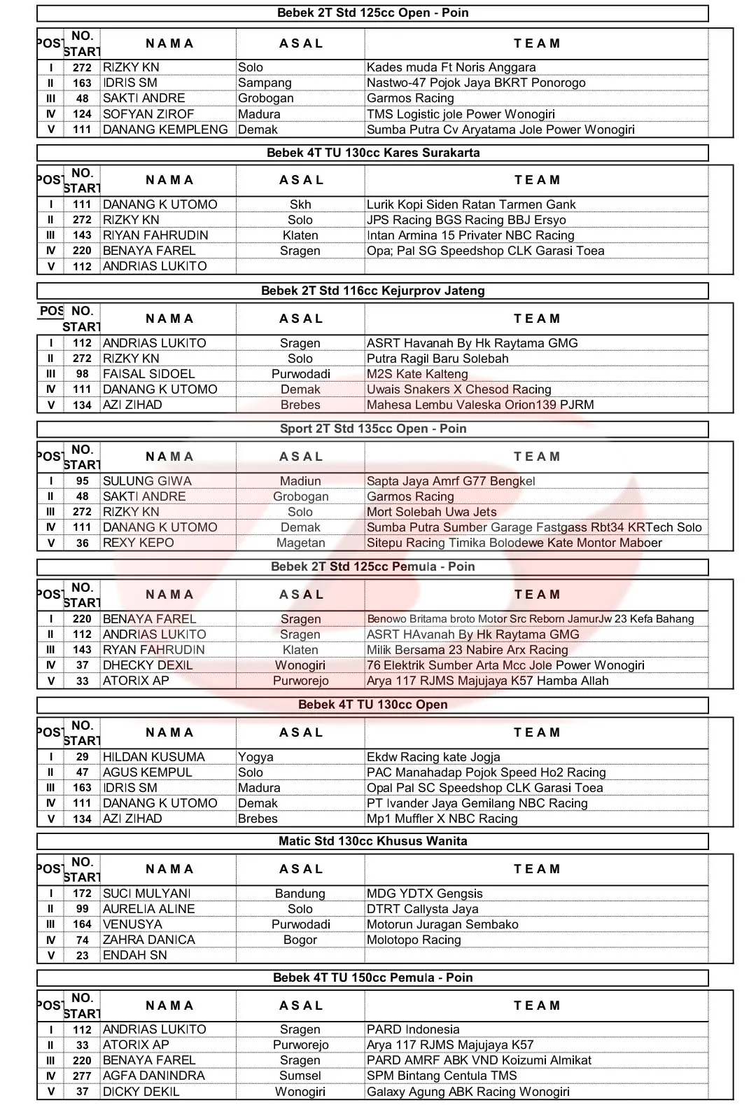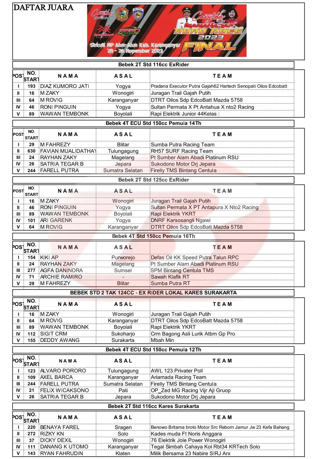 BalapMotor.Net – Berikut merupakan hasil lengkap Grand Final Kejurprov Jateng Casytha Manahadap Road race 2023 yang berlangsung di sirkuit NP. Alun-alun Karanganyar, Jawa Tengah pada 25-26 November 2023. (***)