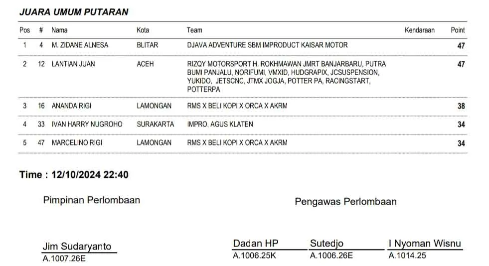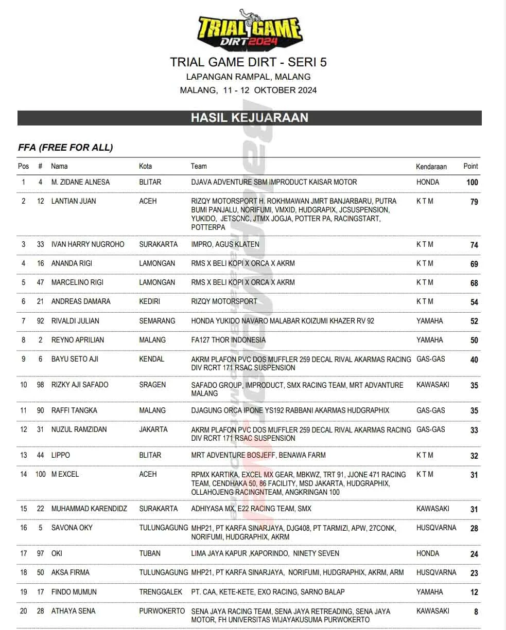 BalapMotor.Net – Berikut merupakan hasil putaran final ajang balap Trial Game Dirt (TGD) 2024 yang berlangsung di Sirkuit Lapangan Rampal, Kota Malang, Jawa Timur, pada 11-12 Oktober 2024. (***)