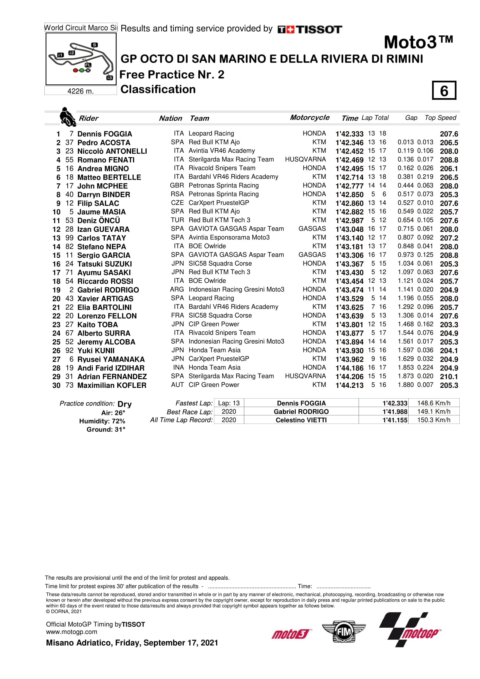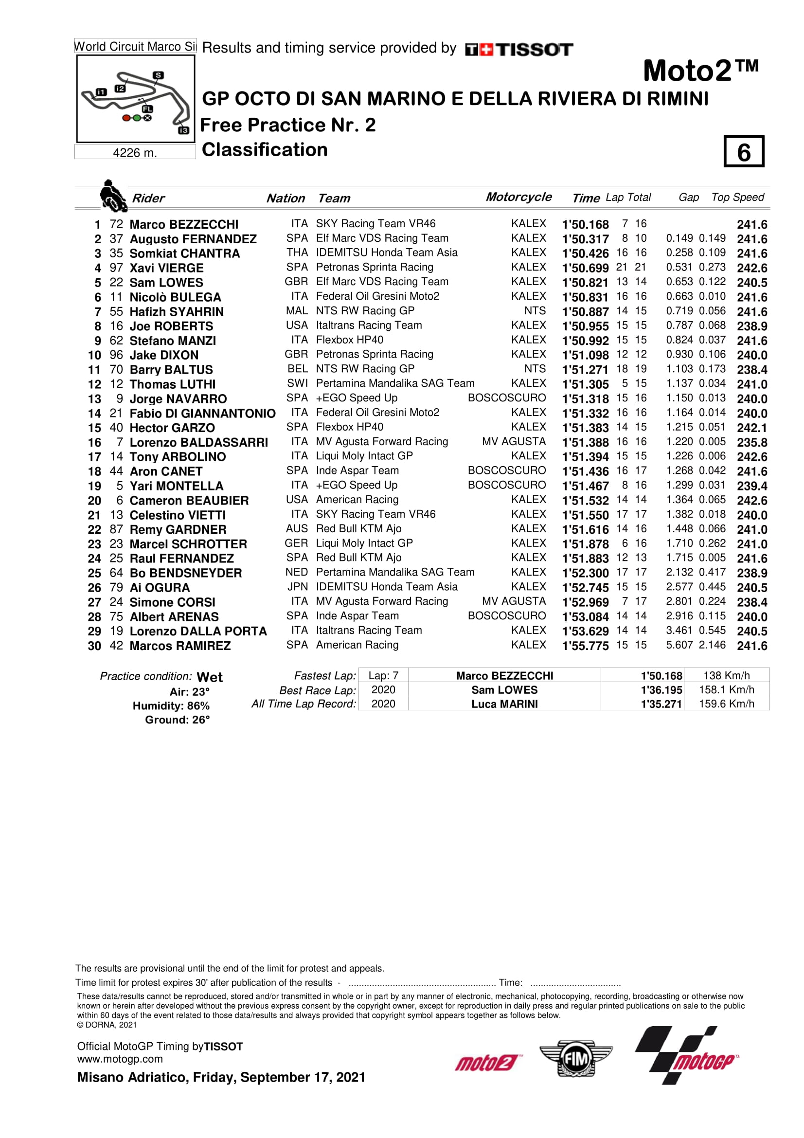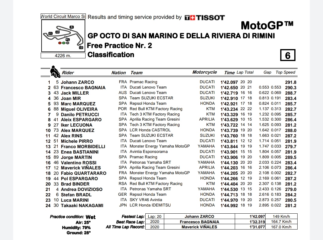 BalapMotor.Net – Berikut merupakan hasil FP1 dan FP2 dari gelaran GP Octo Di San Marino E Della Riviera Di Rimini atau MotoGP San Marimo yang berlangsung di sirkuit Misano, pada hari Jumat (17/9).
