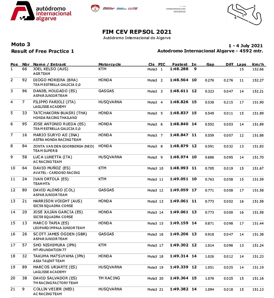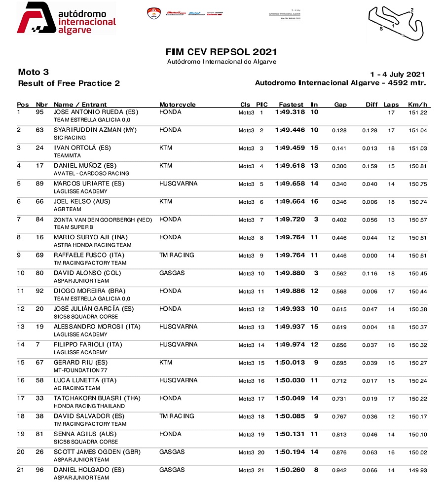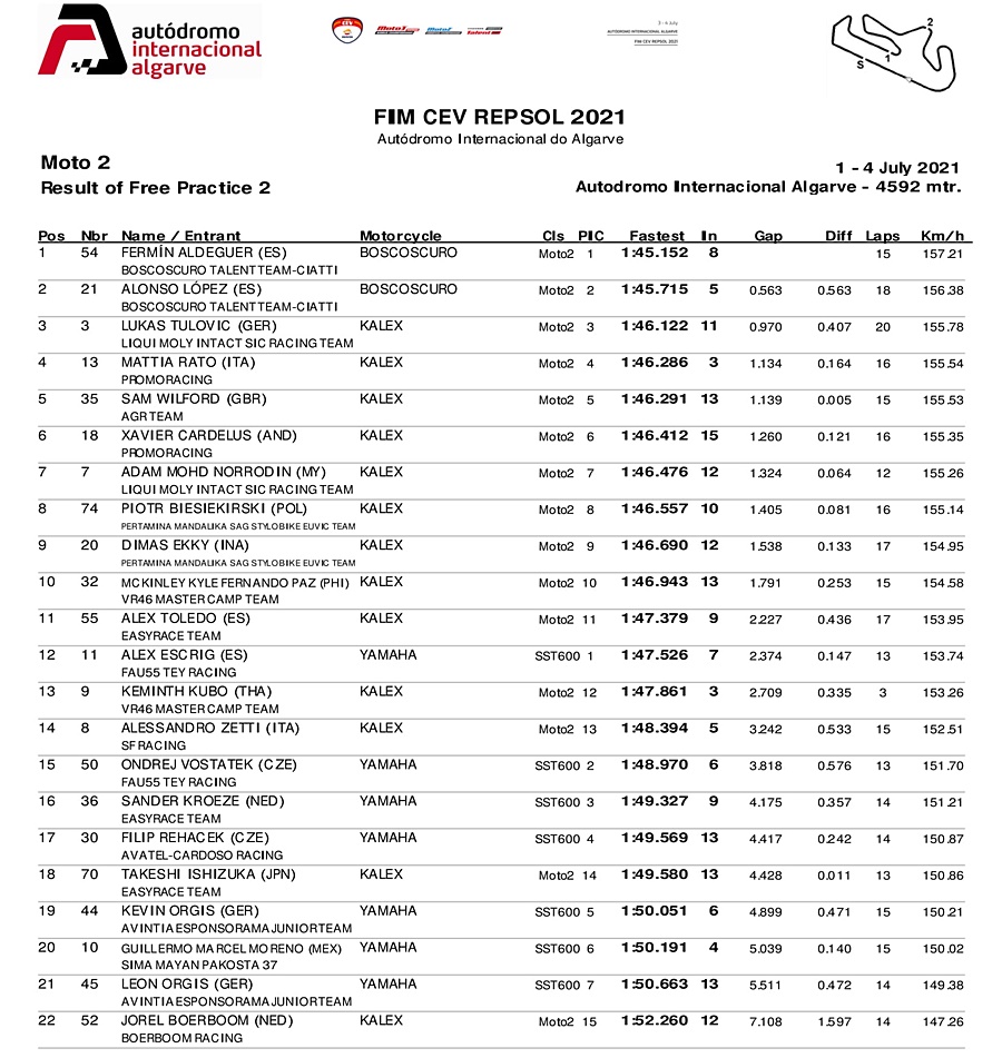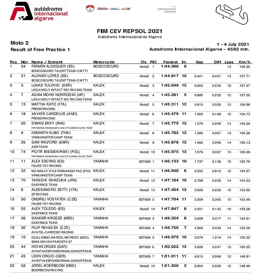 BalapMotor.Net –Berikut kami paparkan hasil dari latihan bebas pertama dan kedua kejuaraan FIM CEV Repsol Moto3 dan Moto2 yang berlangsung di sirkuit Autodromo Internacional do Algarve, Portugal pada Jumat, 2 Juli 2021.