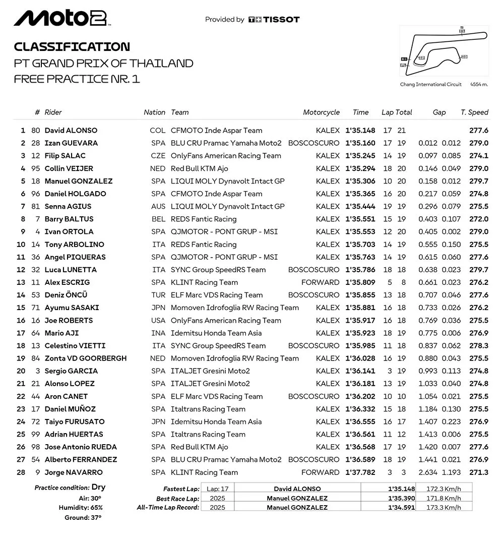 Pada kategori Moto2, David Alonso dari CFMoto Inde Aspar Team berhasil jadi yang tercepat dengan best time 1 menit 35.248 detik disusul Izan Guevara dari BLU CRU Pramac Yamaha Moto2.
