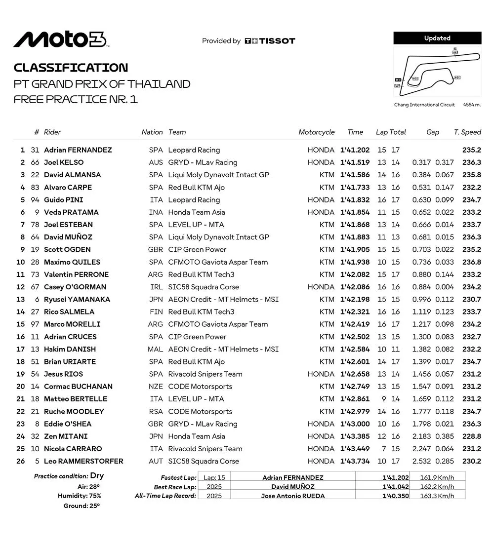 Pada kelas Moto3, Adrian Fernandez dari Leopard Racing berhasil menjadi yang tercepat pada sesi FP dengan best time 1 menit 41.202 detik.