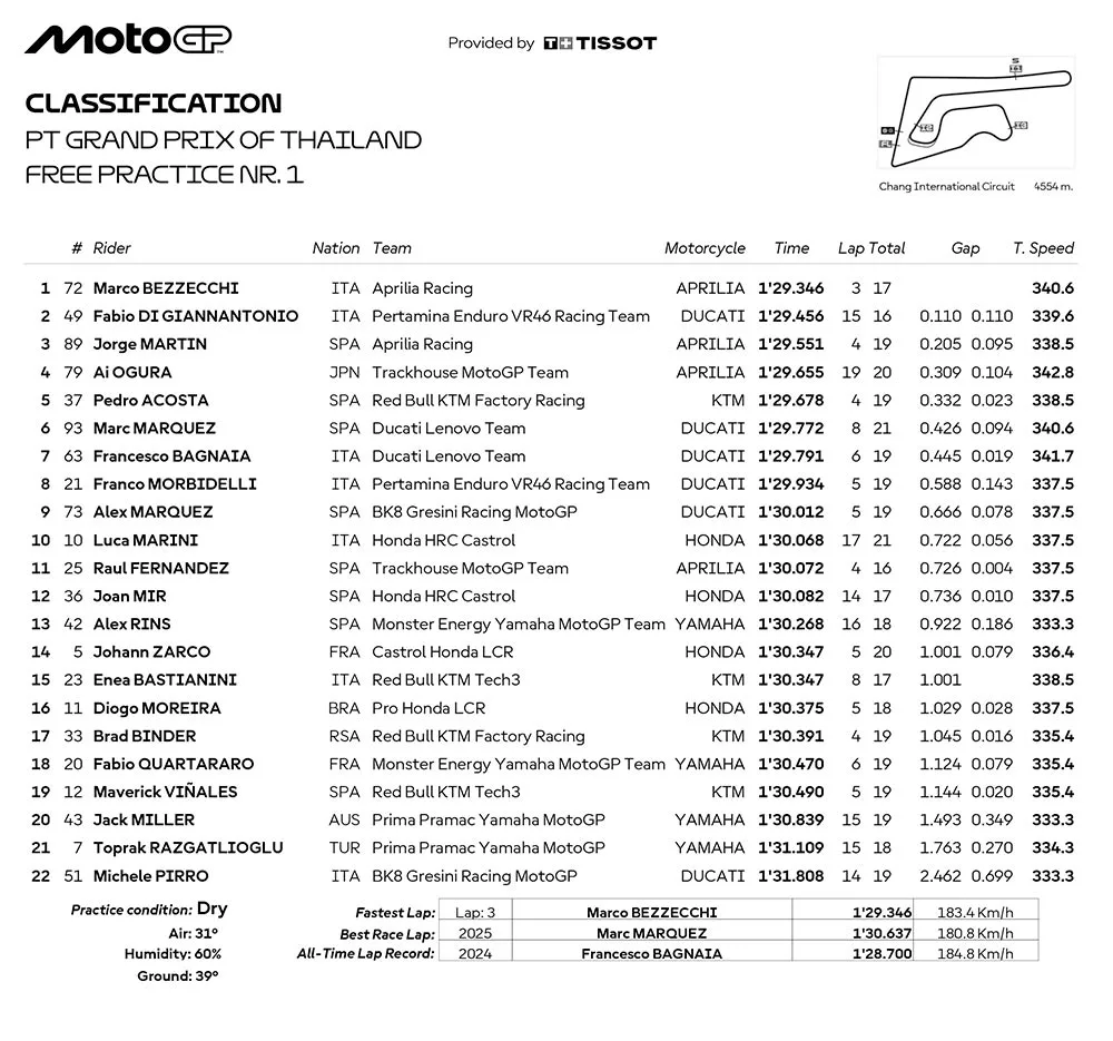 BalapMotor.Net – Setelah menjadi yang tercepat pada sesi testing pra musim, Marco Bezzecchi dari Aprilia Racing langsung jadi yang tercepat dalam sesi FP1 ronde pembuka MotoGP 2026 di Sirkuit Buriram, Thailand (27/2).