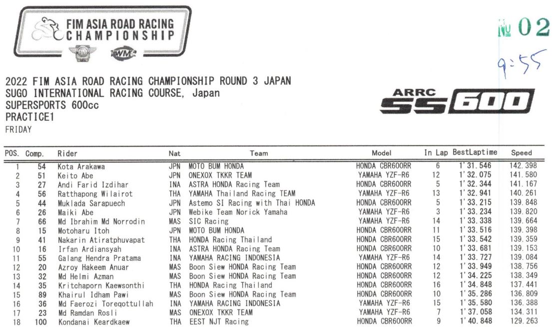 BalapMotor.Net – Berikut merupakan hasil dari sesi Free Practice (FP) 1 dari gelaran 2022 FIM Asia Road Racing Championship Round 3 di Sugo International Racing Course, Jepang pada hari Jumat 12 Agustus 2022.
