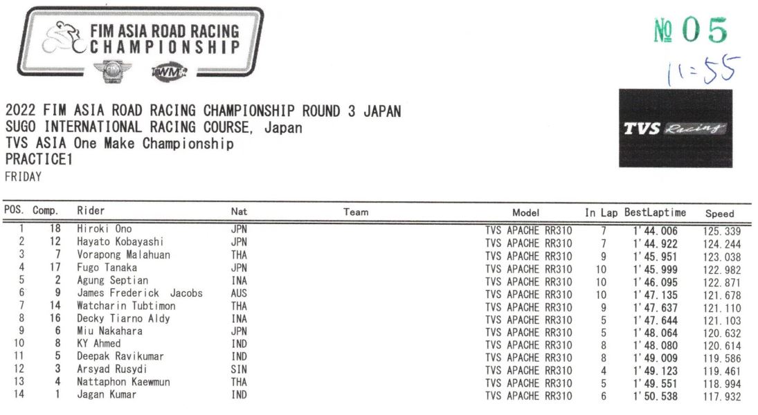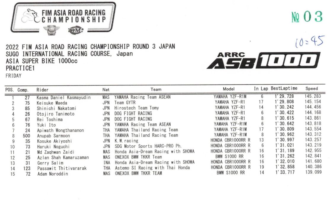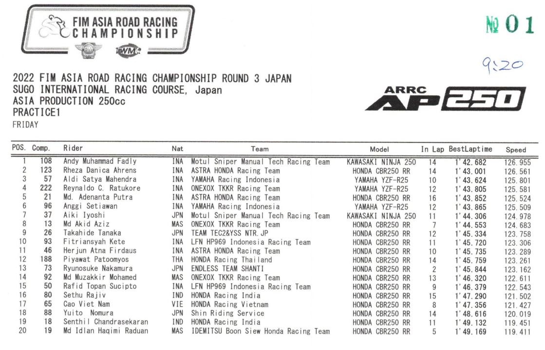 BalapMotor.Net – Berikut merupakan hasil dari sesi Free Practice (FP) 1 dari gelaran 2022 FIM Asia Road Racing Championship Round 3 di Sugo International Racing Course, Jepang pada hari Jumat 12 Agustus 2022.