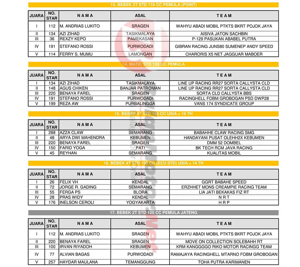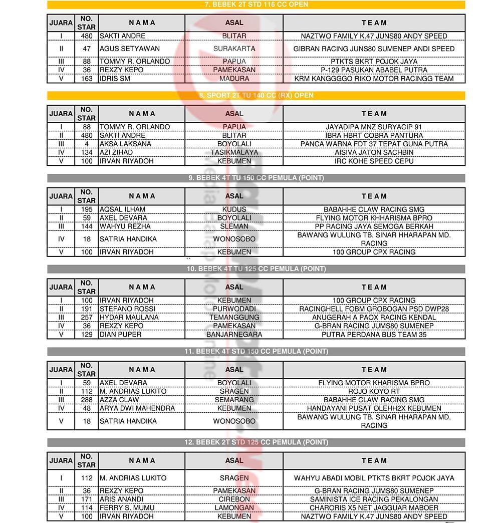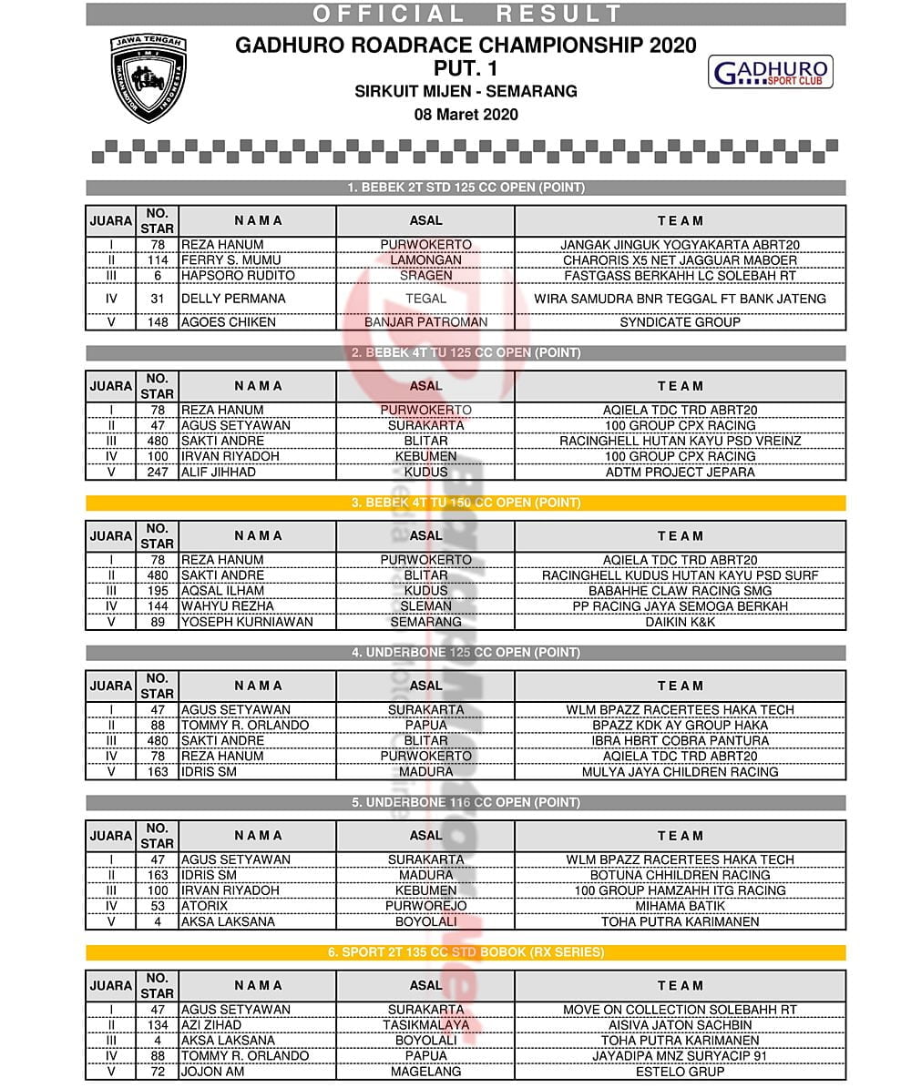BalapMotor.Net – Berikut kami paparkan hasil lengkap para juara dalam kejuaraan Gadhuro Road Race Championship Series 2020 putaran 1 yang berlangsung di sirkuit Mijen, kota Semarang pada Minggu 8 Maret 2020. | Yugo