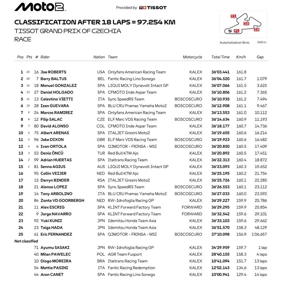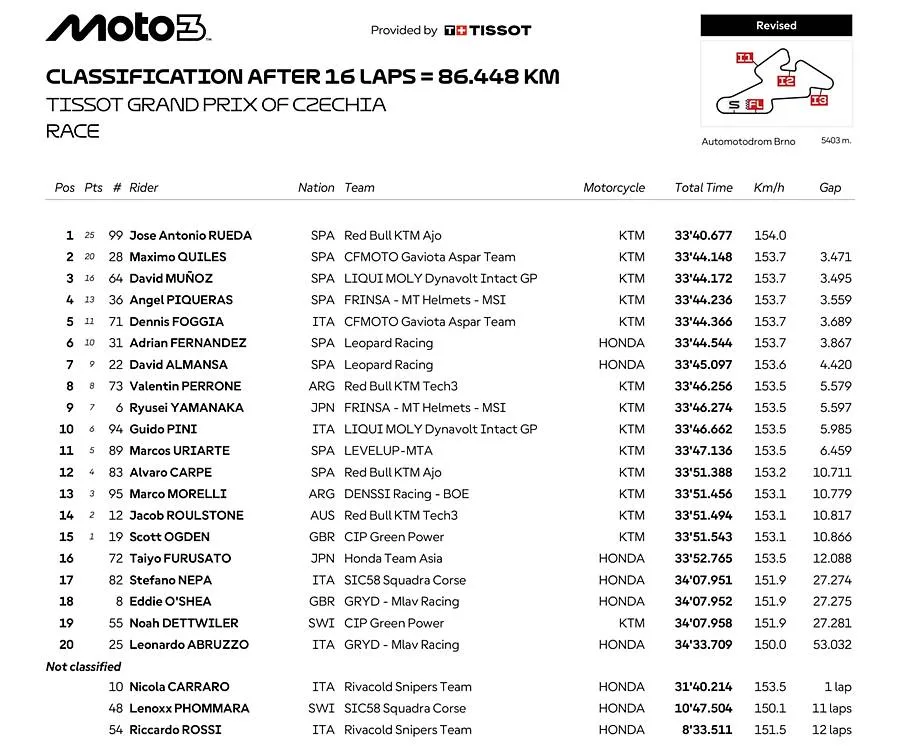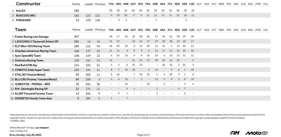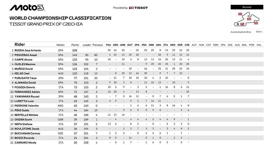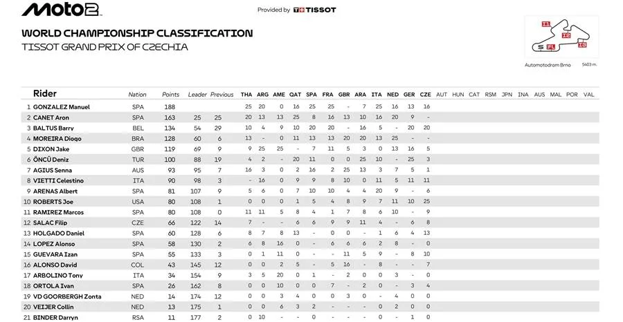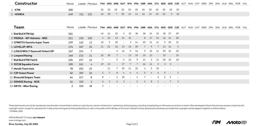 BalapMotor.Net – Berikut merupakan hasil race Grand Prix Ceko dan standing point sementara Kejuaraan Dunia MotoGP, Moto2 dan Moto3 setelah menyelesaikan putaran ke-12 yang berlangsung di sirkuit Autodrom Brno, Republik Ceko pada 18-20 Juli 2025. (**)