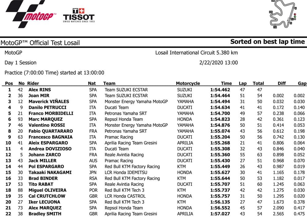 BalapMotor.Net – Berikut ini merupakan hasil dari test pra-musim MotoGP ke 2 yang berlangsung di Sirkuit Losail Qatar 2020. Pada hari pertama di Qatar Duo Suzuki berhasil kasih kejutan dengan berada di posisi teratas.