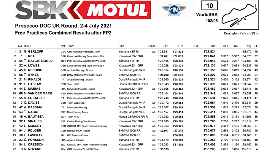 BalapMotor.Net – Berikut kami paparkan hasil kombinasi dari latihan bebas pertama dan kedua Kejuaraan Dunia Superbike yang berlangsung di sirkuit Danington Park, Inggris pada Jumat, 2 Juli 2021.