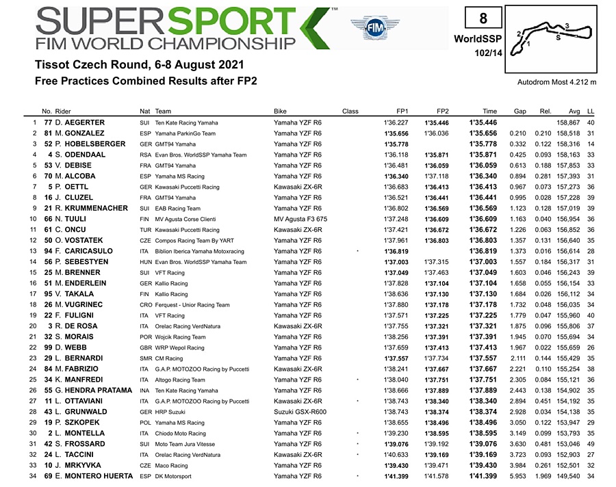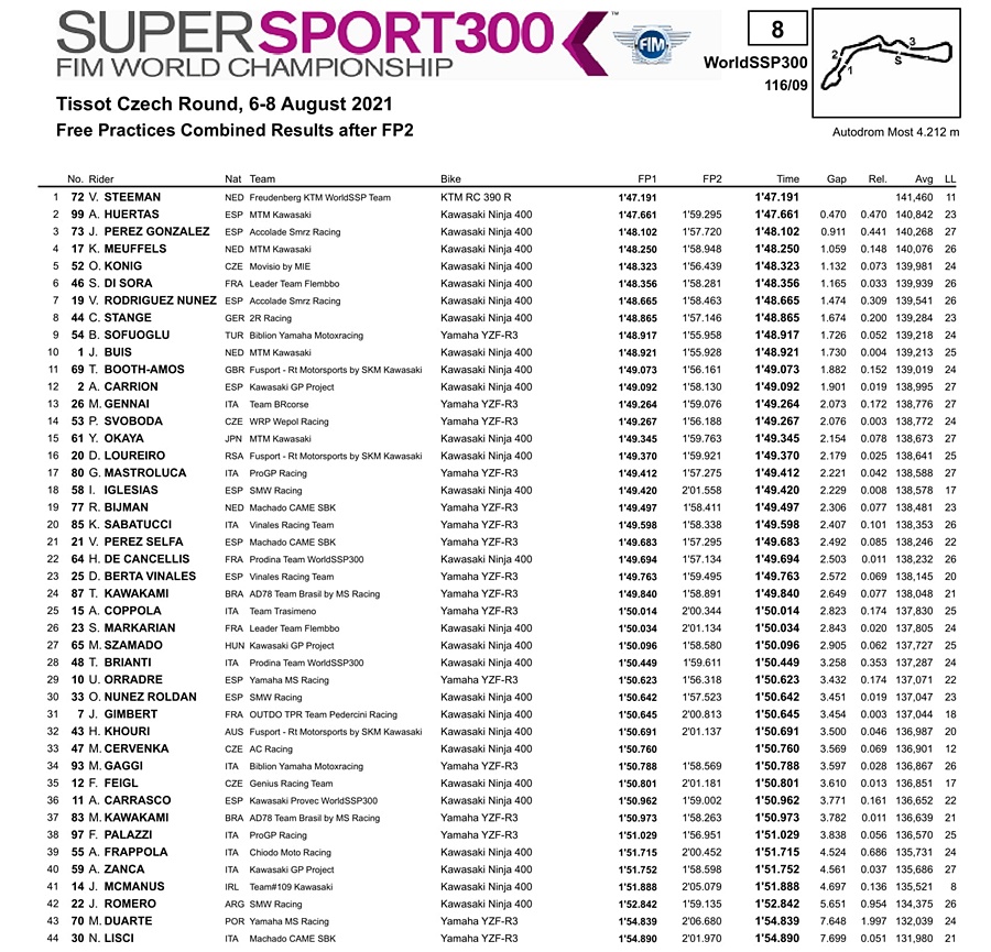 BalapMotor.Net – Berikut kami paparkan hasil lengkap latihan bebas pertama dan kedua Kejuaraan Dunia Superbike, Supersport dan Supersport 300cc yang berlangsung di sirkuit Autodrom Most, Republik Ceko pada Jumat 6 Agustus 2021.