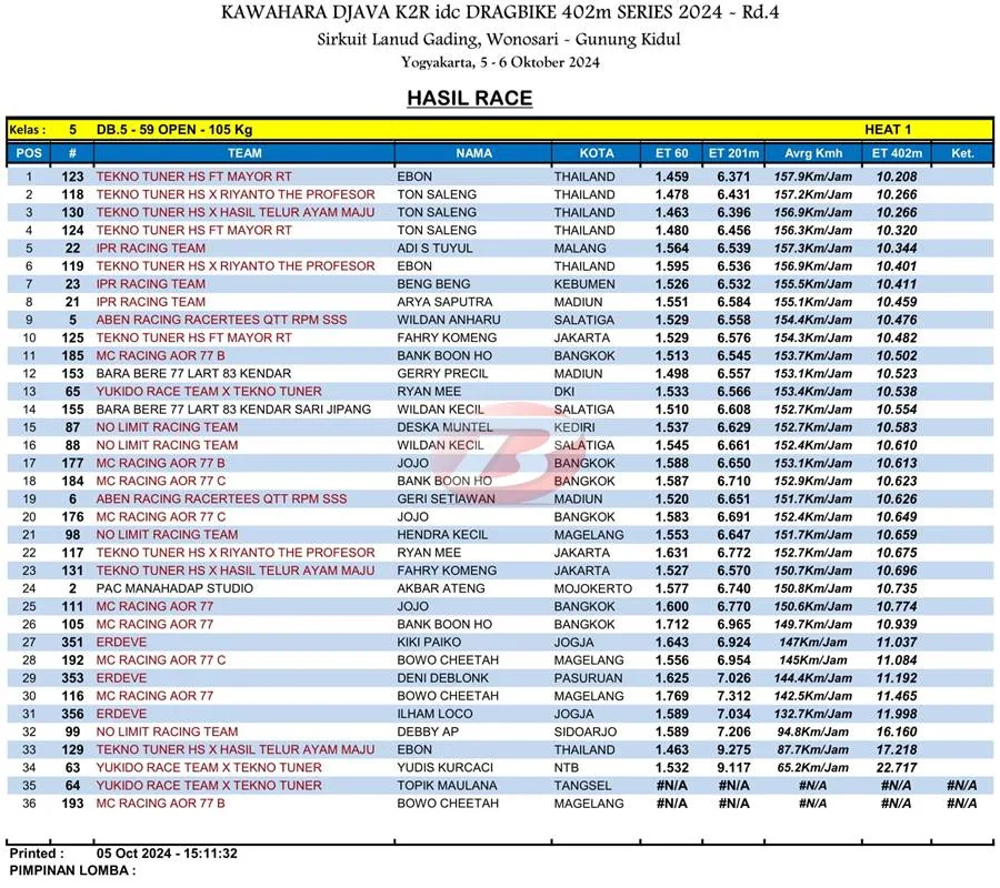 BalapMotor.Net – Berikut merupakan hasil heat pertama kategori kelas 402m kejuaraan balap lurus Kawahara Djava K2R IDC Drag Bike Championship 2024 putaran keempat yang berlangsung di sirkuit NP. Lanud Gading Wonosari, Yogyakarta pada Sabu 5 Oktober 2024. (***)
