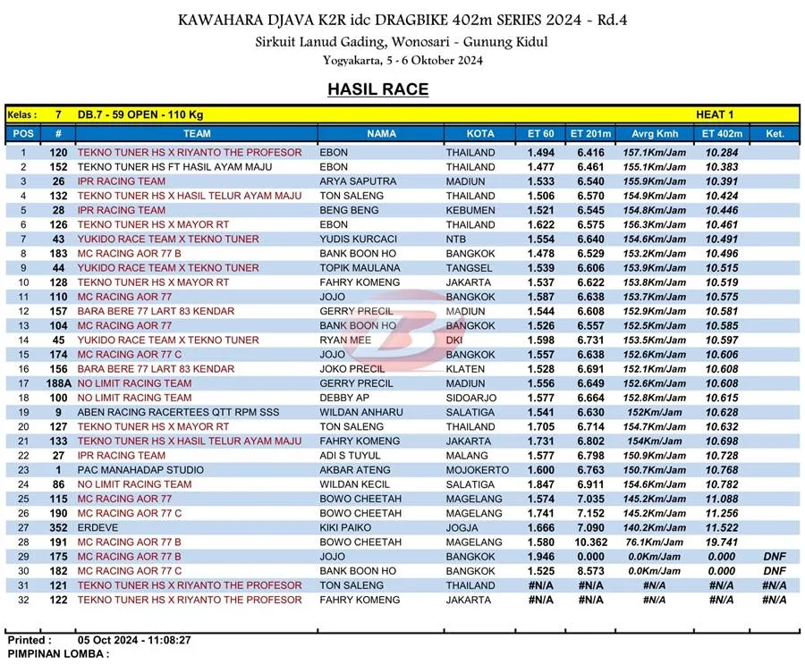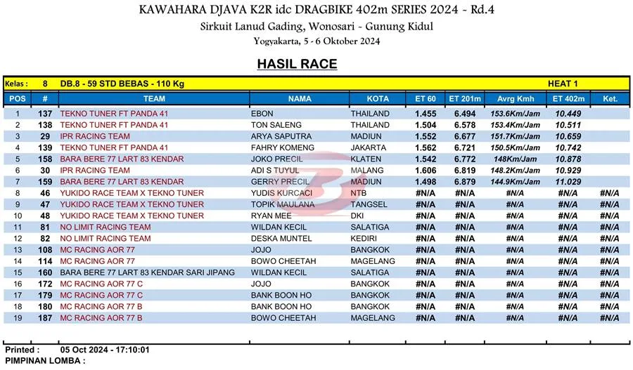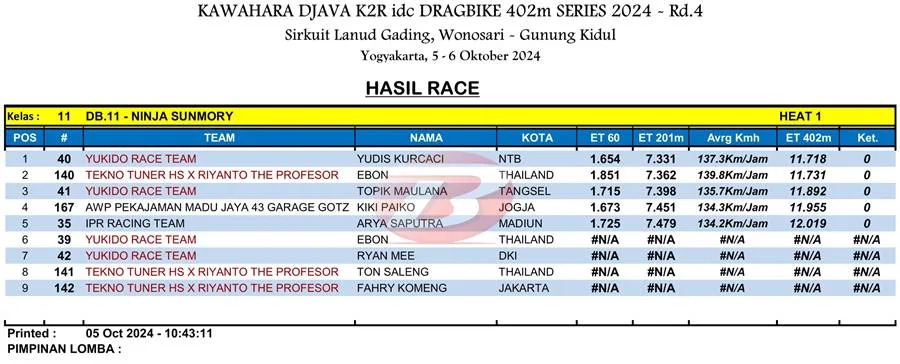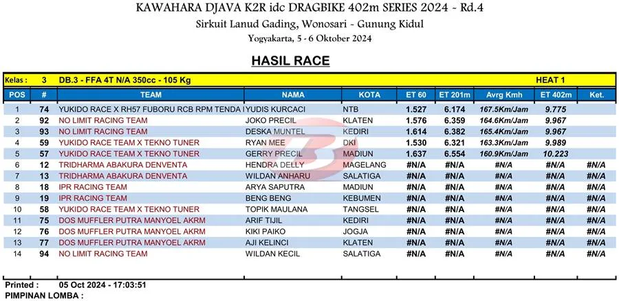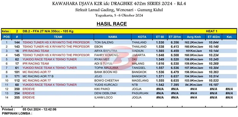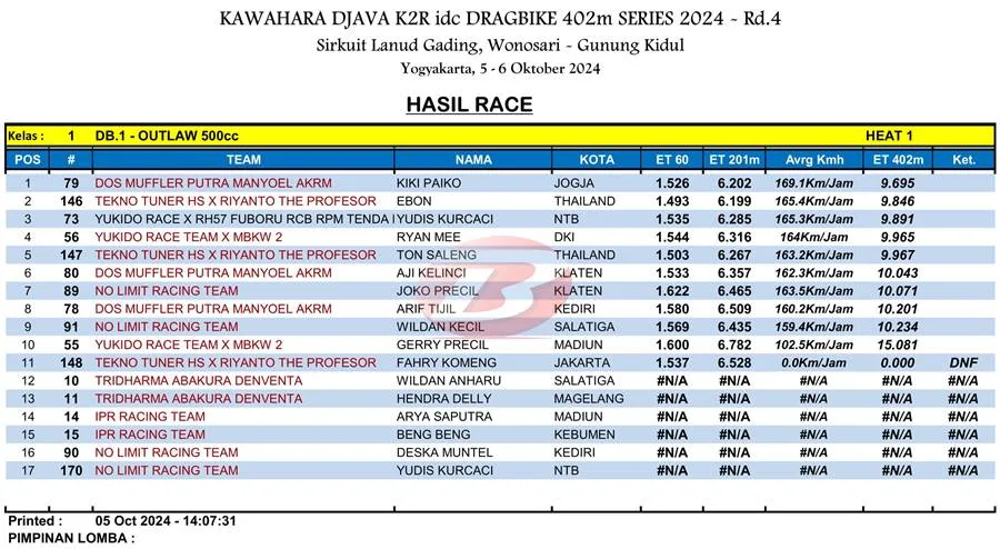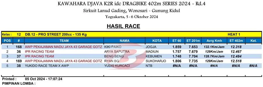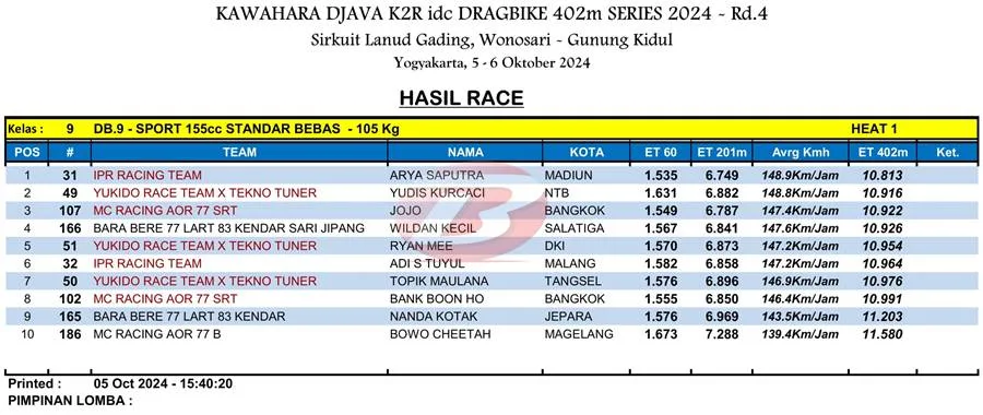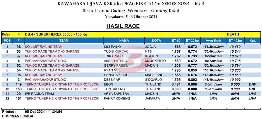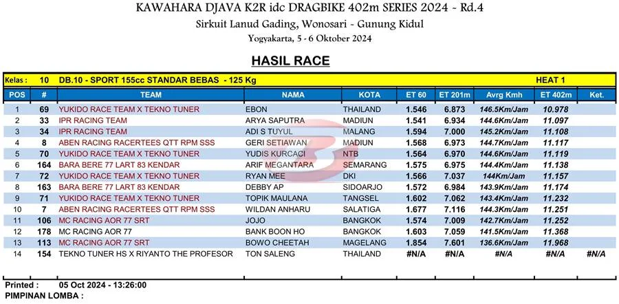 BalapMotor.Net – Berikut merupakan hasil heat pertama kategori kelas 402m kejuaraan balap lurus Kawahara Djava K2R IDC Drag Bike Championship 2024 putaran keempat yang berlangsung di sirkuit NP. Lanud Gading Wonosari, Yogyakarta pada Sabu 5 Oktober 2024. (***)